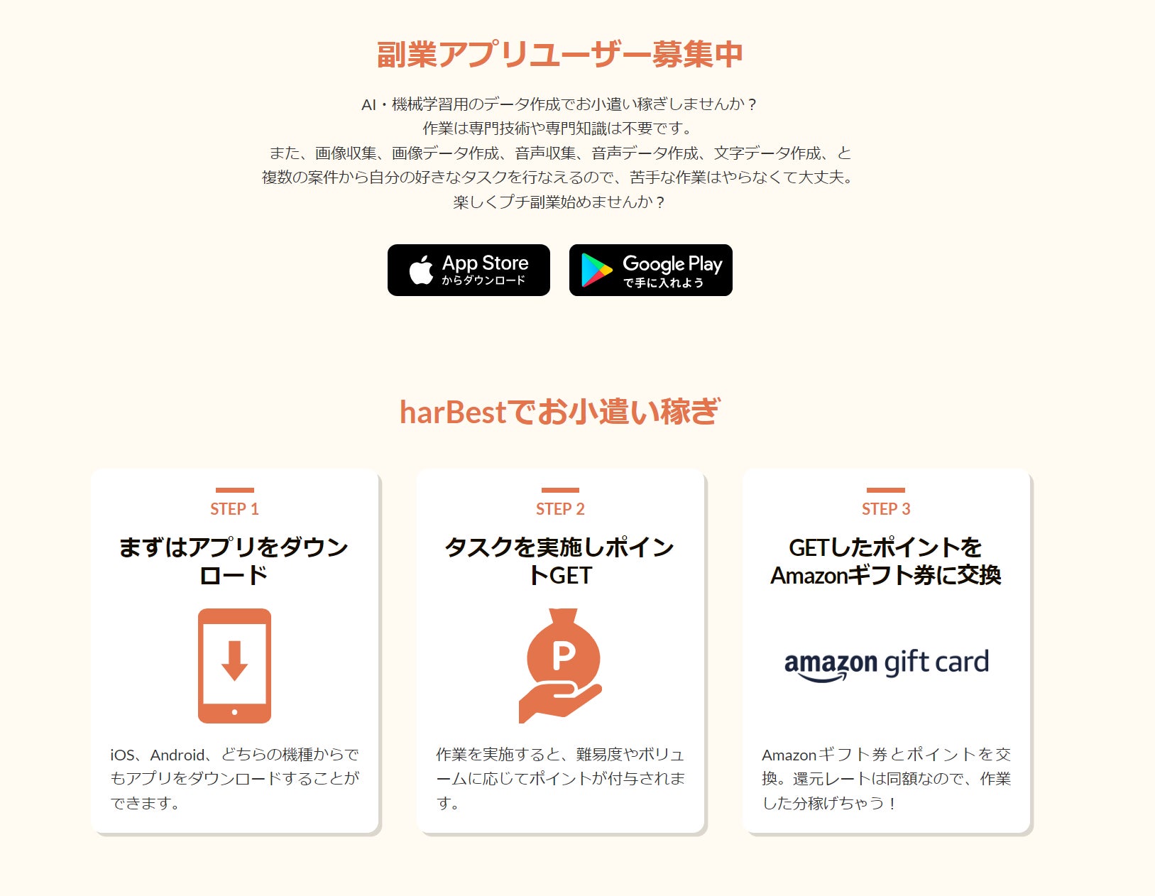 3周年&大幅リニューアルを記念して、期間内にスマートフォンアプリ「harBest」にログインいただいた全ユーザーの中から先着300名様限定で100ポイントをプレゼントいたします。スマートフォンアプリ「harBest」は、空き時間にAI開発にかかわるデータ収集・アノテーションを行うことで、Amazonポイントがもらえる日本で唯一の副業アプリです。是非一度体験してみてください。