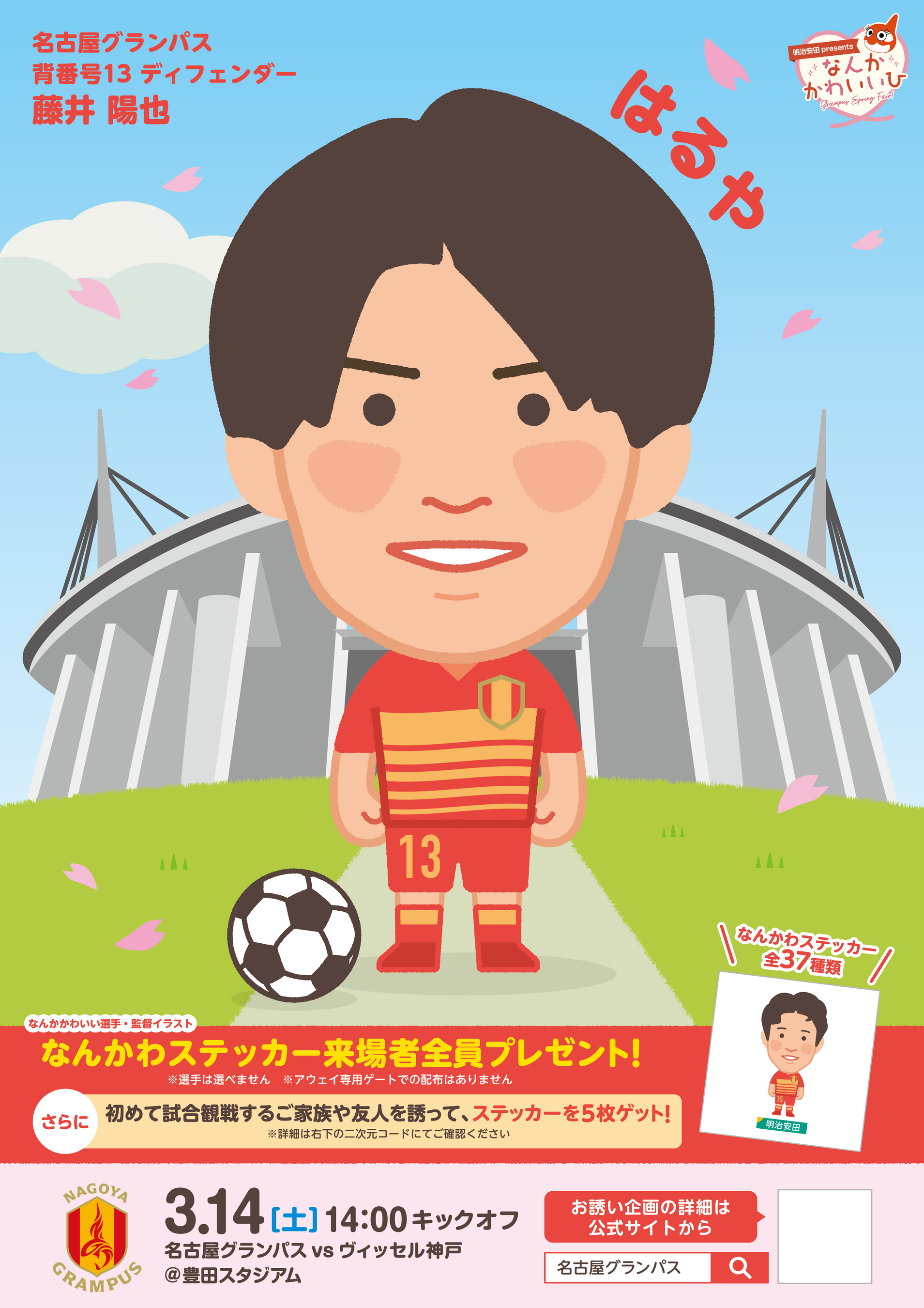 名古屋グランパスでは、3/14(土)明治安田J1百年構想リーグ 第6節 ヴィッセル神戸戦にて開催する「明治安田Presents GRAMPUS SPRING FESなんかかわいいひ」の特別企画として、監督・選手がそれぞれ描かれた全37種類のオリジナルポスターを名古屋市営地下鉄の各駅に掲出します。