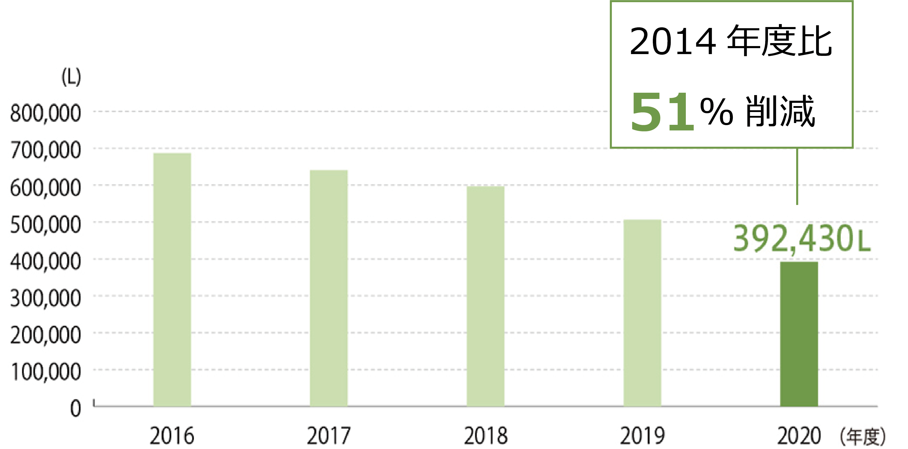 これらの施策により、2020年度のガソリン使⽤量は、対策前の2014年度と⽐較して51%改善しました。