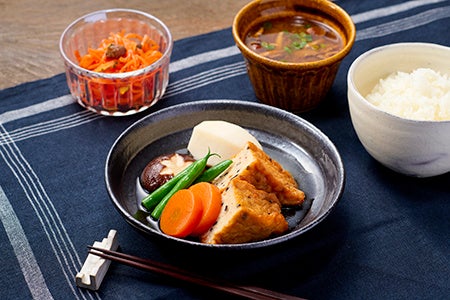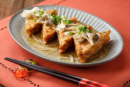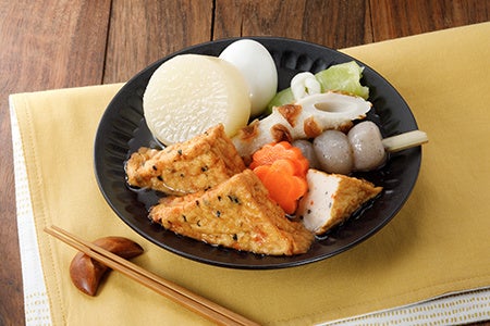 従来品と比べ、さらにプリッと弾力を増し、同時に汁吸いがよくなり、だしの旨みがしっかり染み込みますので、煮物やおでんのだしが口の中でジュワッと広がります。にんじん・ひじき・黒ごま入りで彩りもよく、これから寒い時期のおでんや煮物、お鍋の具材などにぴったりです。