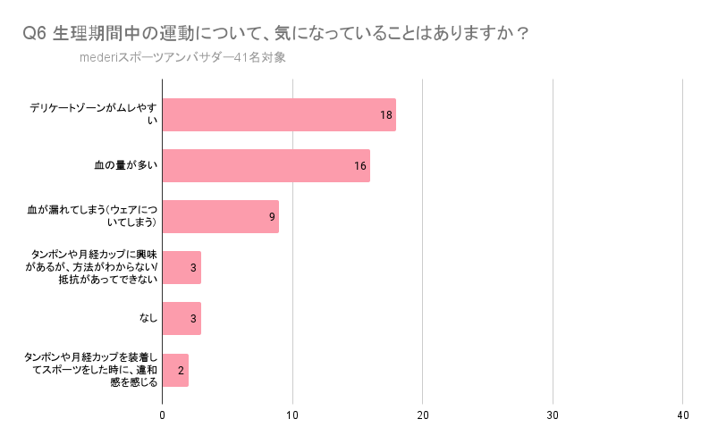 6.運動していく中で気になることは「デリケートゾーンがムレやすい」が約半数に。また2割が「血が漏れてしまう(ウェアについてしまう)」と回答。