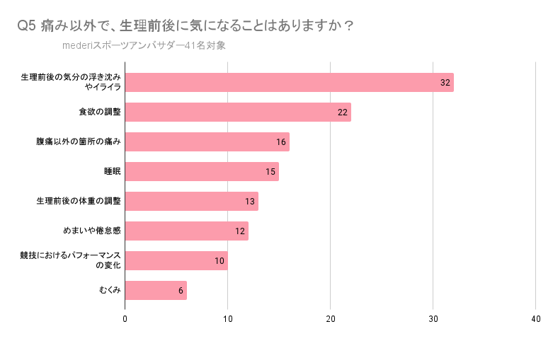 5.痛み以外で気になることは「生理前後の気分の浮き沈みやイライラ」が約8割という結果に。精神面でも生理の影響があることが伺える。また半数以上が「食欲の調整」と回答。アスリートにとって生理前後の食事管理は気になる点の一つである。