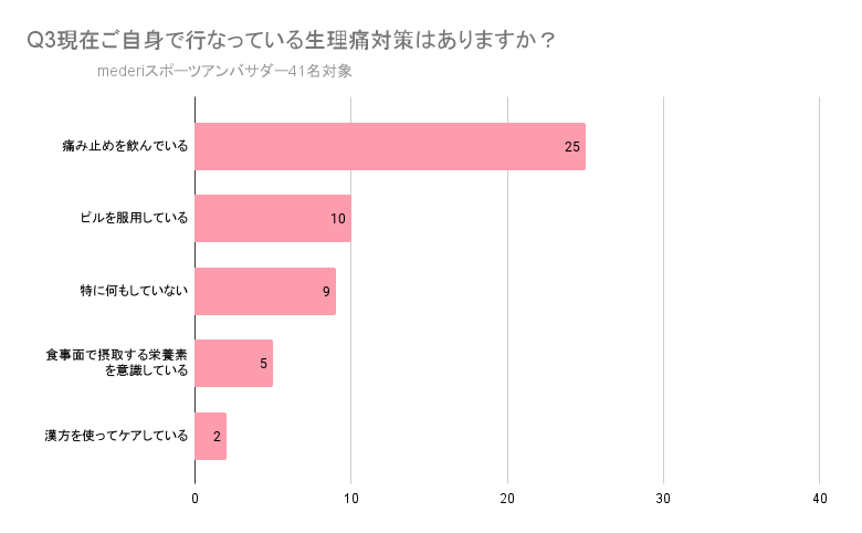3.生理痛対策第1位は「痛み止めを飲んでいる (60.9%)」。痛みを薬で緩和しながら、競技と上手く向き合っている状況が伺える。第2位は「ピルを服用している(24.3%)」。ピルによる生理対策も選択の一つとして考えられている。