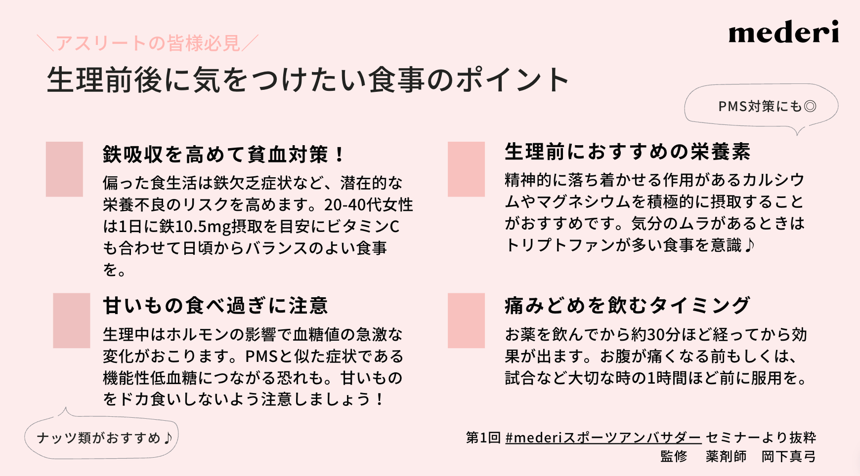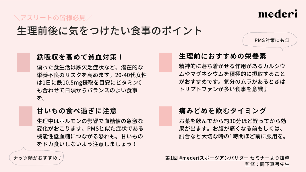 mederiスポーツアンバサダーの女性へ「スポーツと生理/PMSとの向き合い方」に関するセミナーと事前アンケートを実施。
