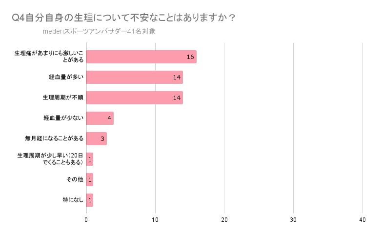 4.生理の際に不安なことは、「生理痛があまりにも激しい(39%)」が第1位に。また3人に1人は「経血量が多い」ことを不安に思っていることが確認できる。生理期間は、競技に向き合いながらも生理痛や経血のなど、競技以外にも様々な悩みがあり、「生理不順」について不安に思っているアスリートも。