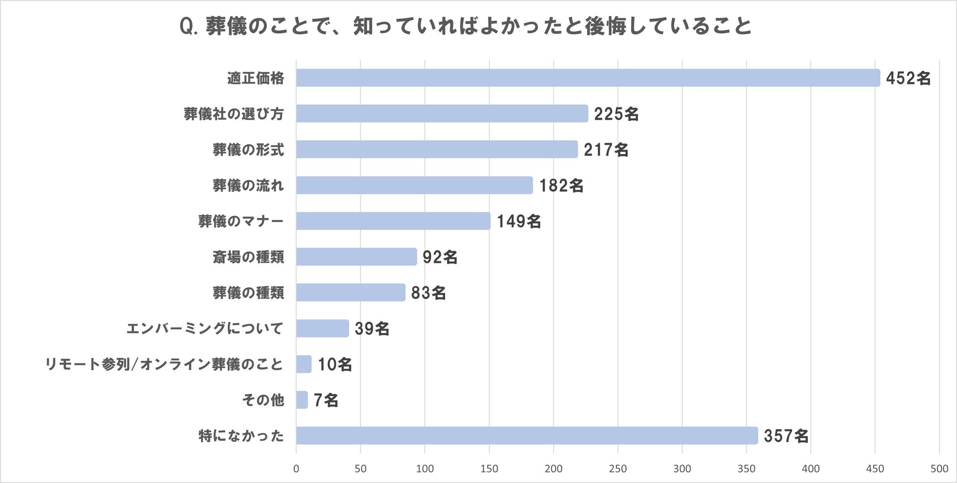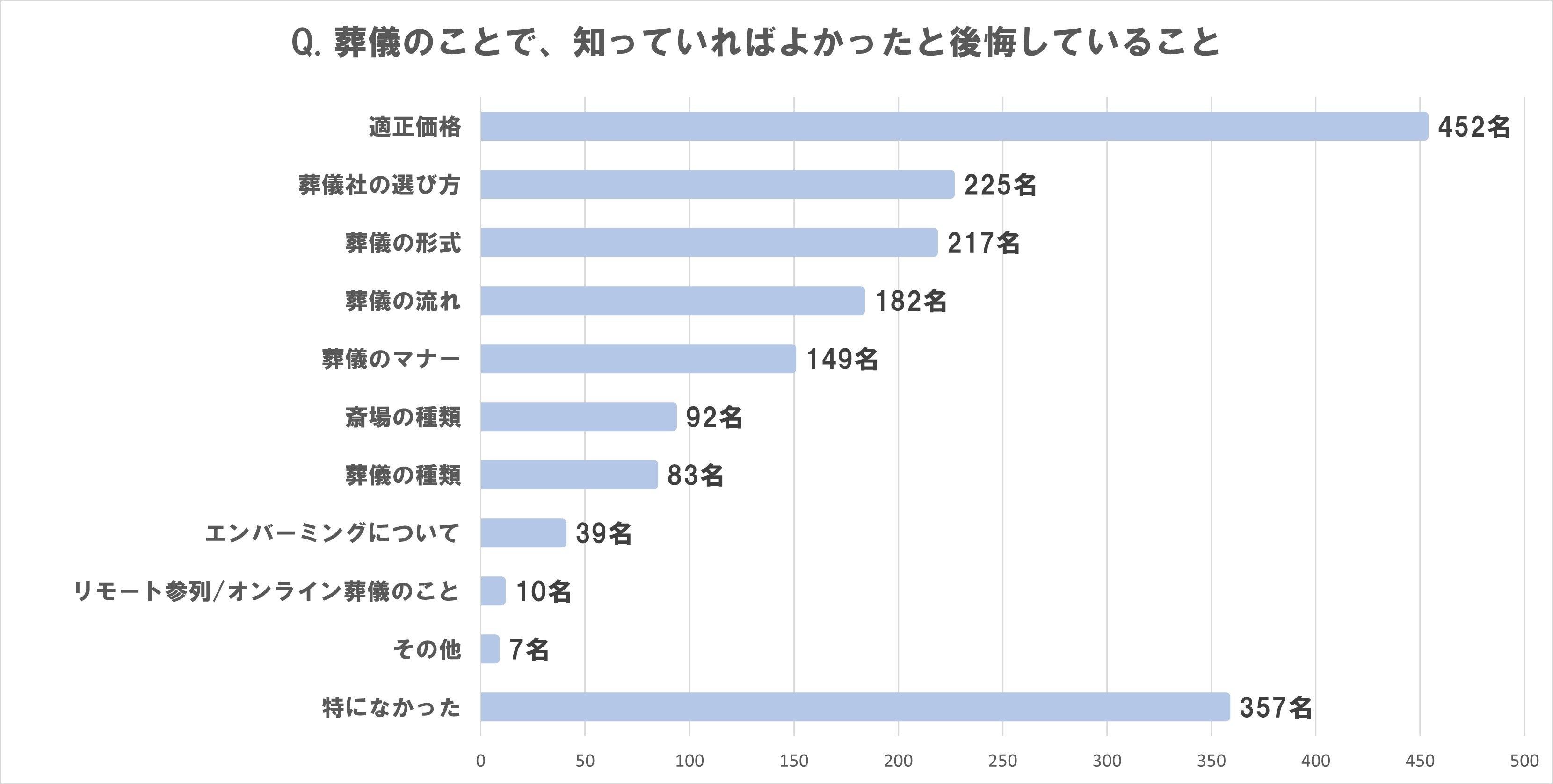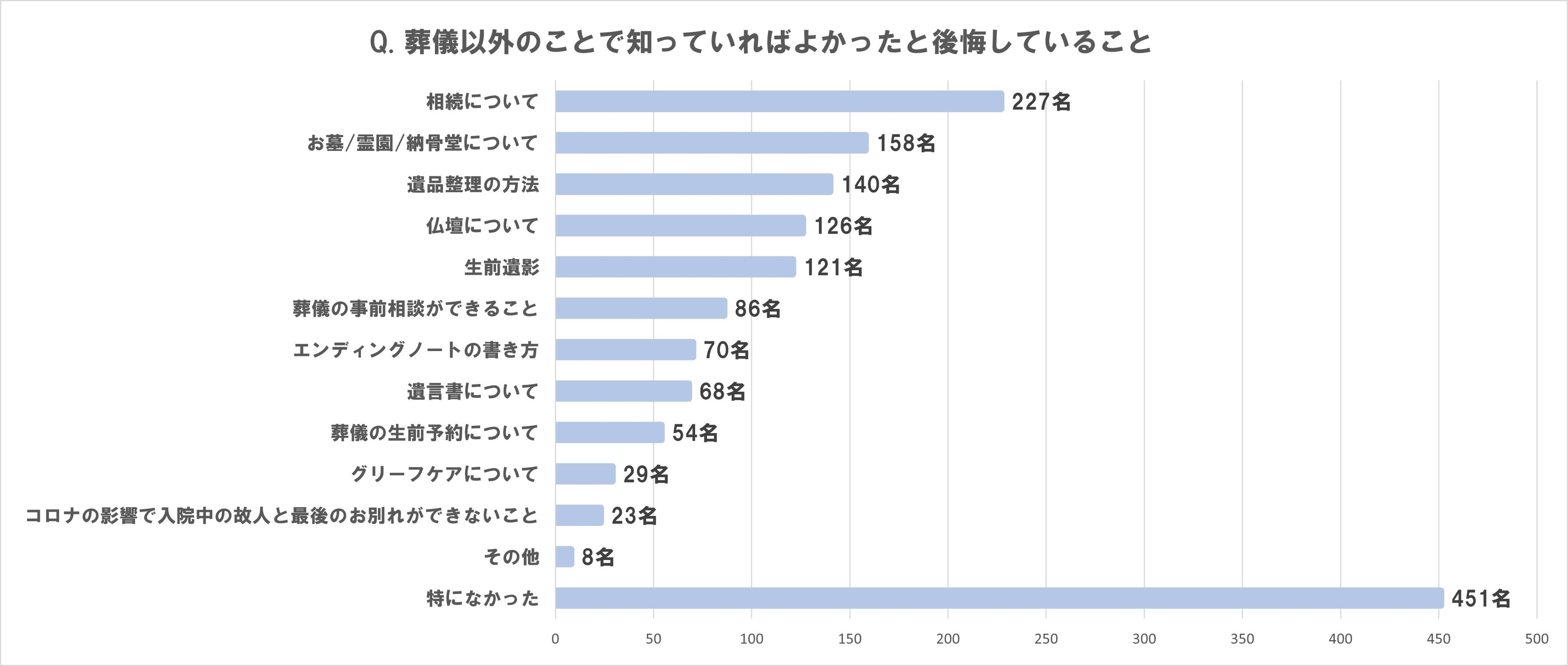 葬儀以外のことで知っていればよかったと後悔している人は、全体の55%。 具体的な内容は、1位「相続」、2位「お墓・霊園・納骨堂」、3位「遺品整理」。 トップ3は5年間変わらず。 |