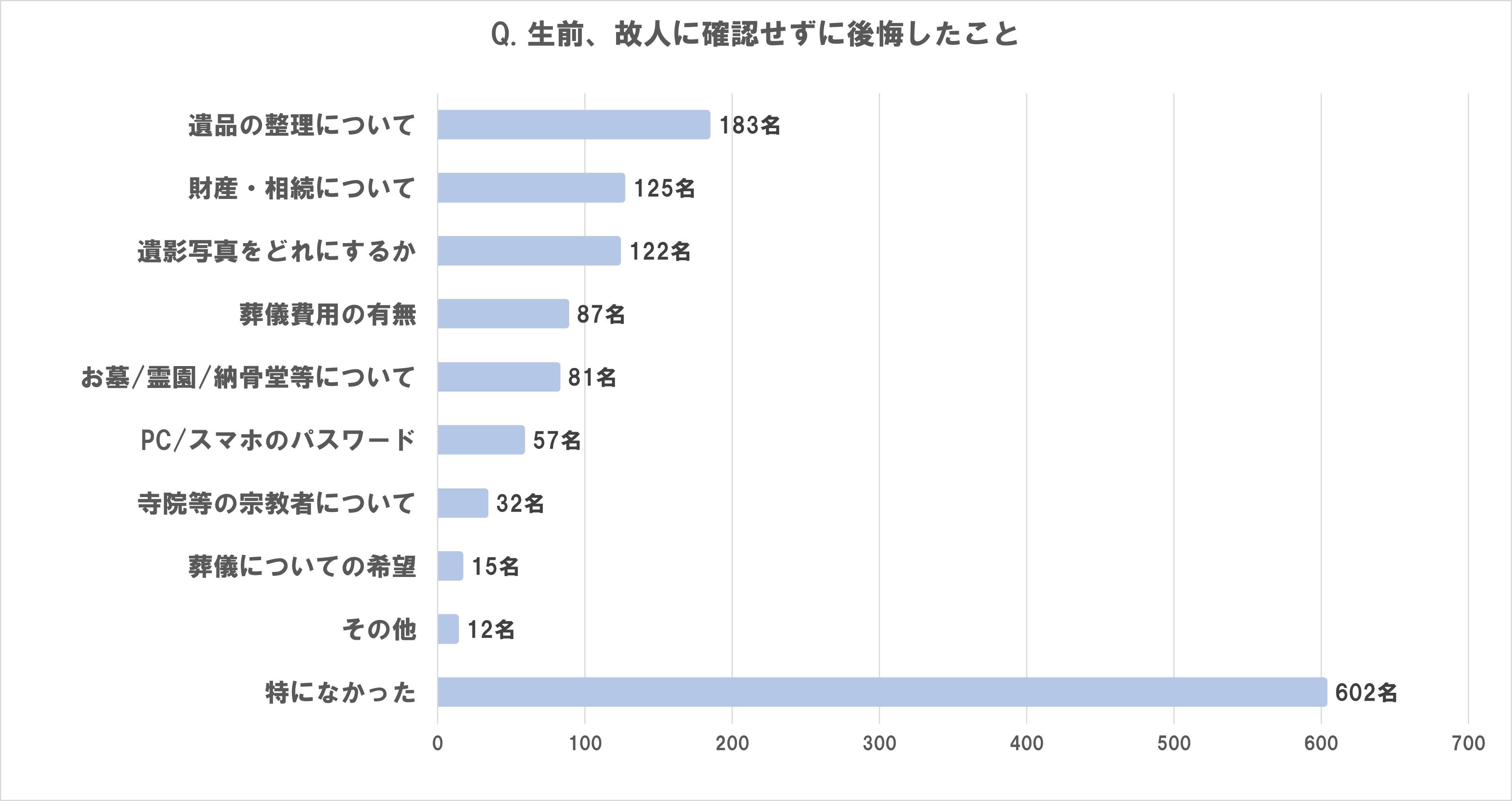 生前、故人に確認せずに後悔したことがある人は40%。 2020年52%⇒2021年43%⇒2022年40%⇒2023年41%と年々減少傾向。 具体的な内容は、1位「遺品整理」、2位「財産・相続」、3位「遺影写真」。 |
