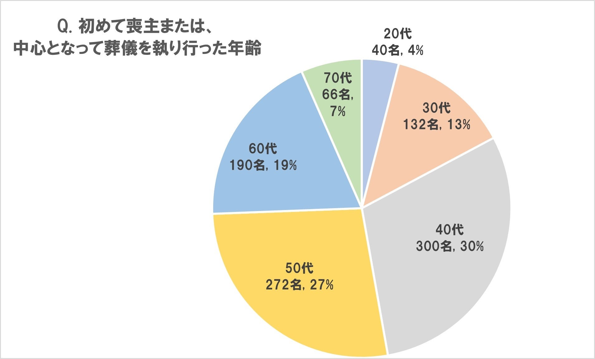 初めて喪主または葬儀を執り行った平均年齢は「50歳」。 2020年の47.5歳から上がり続け、昨年の51.2歳をピークに今年は1.2歳下がる。 年代別にみると「40代」が全体の30%で最も多く、次いで「50代」が27%。 |