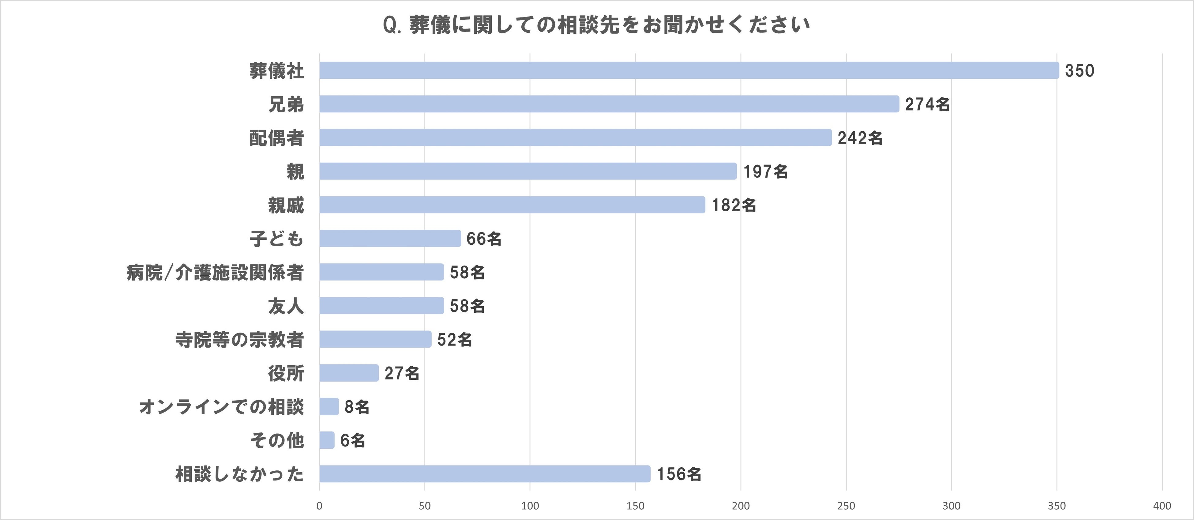 葬儀について、84%の人が誰かに相談をしている。 1位「葬儀社」、2位「兄弟」、3位「配偶者」。 「葬儀社」はコロナ禍の2021年、2022年は3位になるも、2023年から1位に復活。 コロナ禍の間は、配偶者など一緒に住む身近な人に相談する人が多かったが、 日常が戻ったことで「兄弟」「親」「親戚」など同居者以外の人に広がる。 |