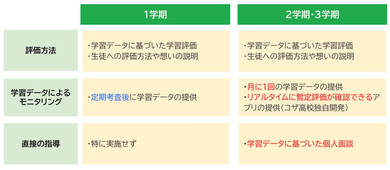 生徒に対しては、評価規準を年度初めに明示した上で、定期的にフィードバックや個人面談などを行いました。2023年度の2学期以降は、月に1回、生徒が自身の学習進度や取り組み状況がわかる詳細なデータを確認できる機会を設け、暫定的な評価をリアルタイムで把握できるようにしました。こうしたサポートを行うことによって、生徒が自身の現状や課題を認識し、何をすべきかを考え、主体的に学習に取り組むよう促しました。