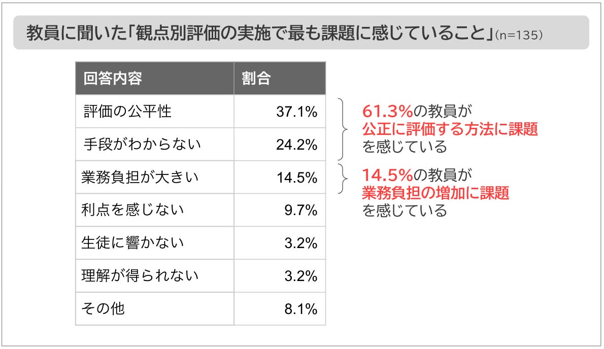 しかしながら、観点別学習状況の評価(観点別評価)、とりわけ「主体的に学習に取り組む態度」の評価については、全国の多くの教員が課題や不安を感じていることがさまざまな調査からわかっています。Libryがユーザー向けに実施したアンケートでも、回答した教員(135名)の7割以上が自信を持った学習評価が実施できていない様子。その中で、課題に感じている要素として37.1%が「評価の公平性」、24.2%が「評価手法の困難さ」を挙げています。また、評価方法を工夫して実施している教員でも「評価指標を得るために業務負担が大きくなってしまう」と感じる場合があるようです。