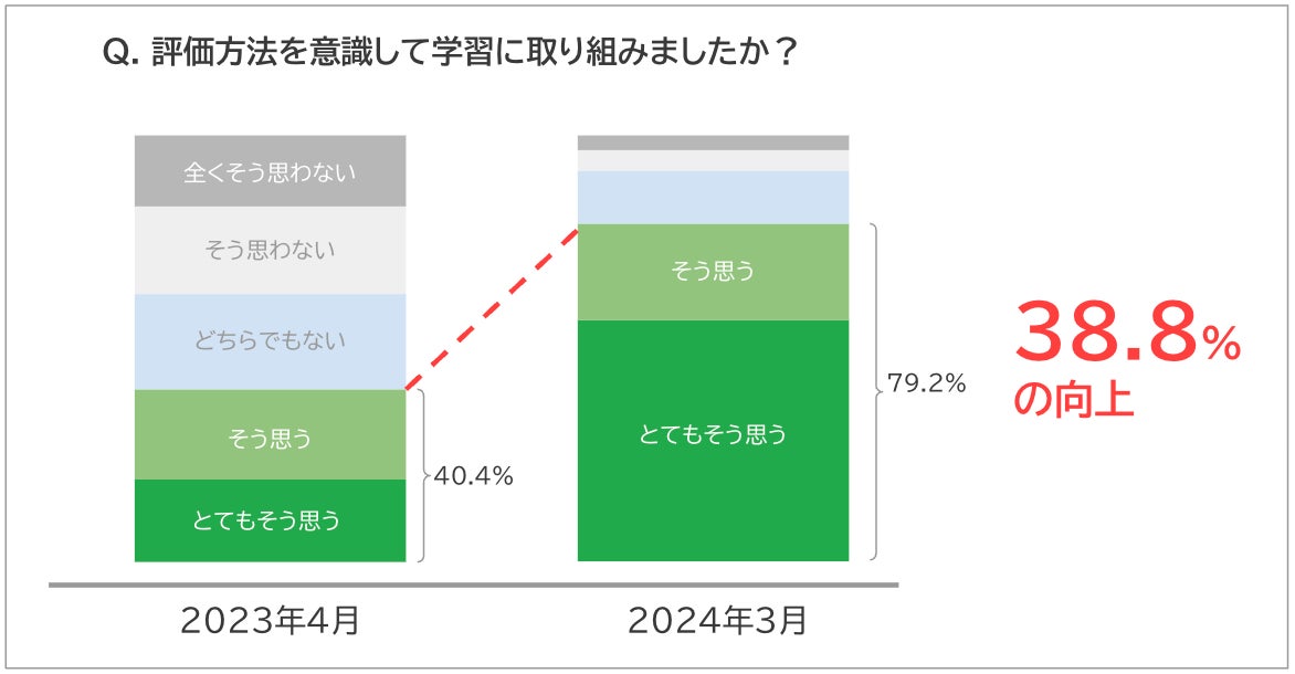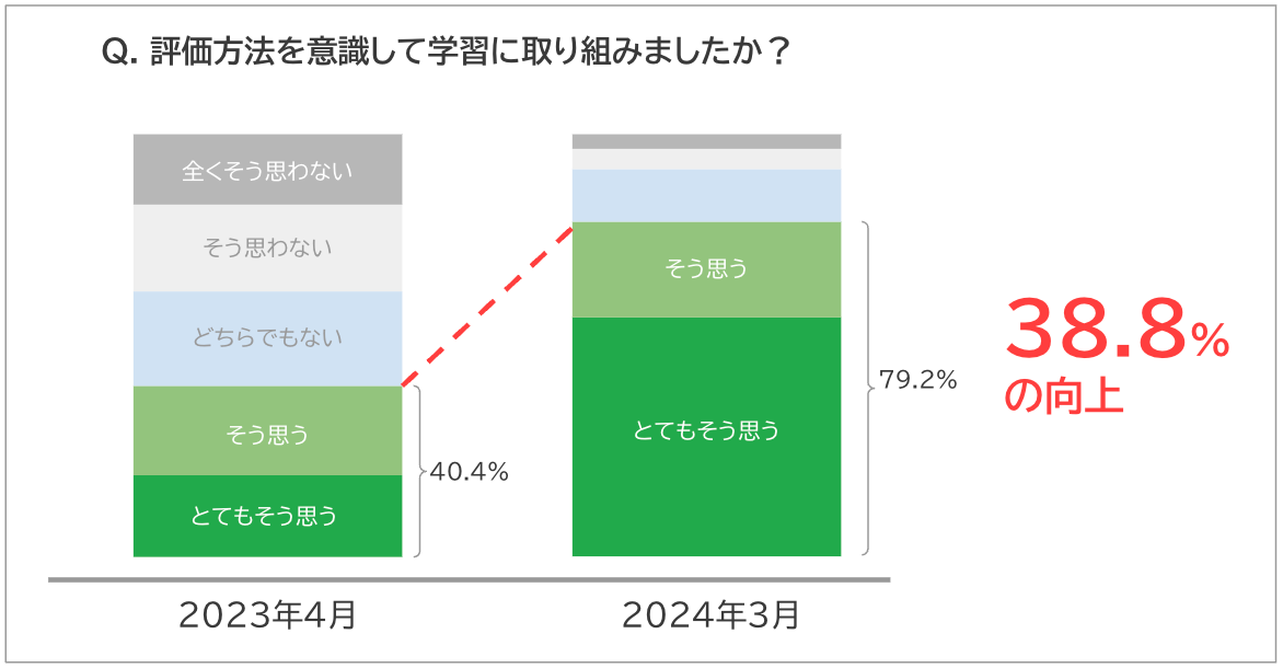 また、「評価方法を意識して学習に取り組みましたか?」という質問に対して、「とてもそう思う」もしくは「そう思う」と肯定的な回答をした生徒の割合は、1学期末に40.4%だったところ、学年末には79.2%と上昇。そのうち、「とてもそう思う」と回答した生徒は、1学期には19.3%でしたが、学期末には56.6%と飛躍的に増加しました。