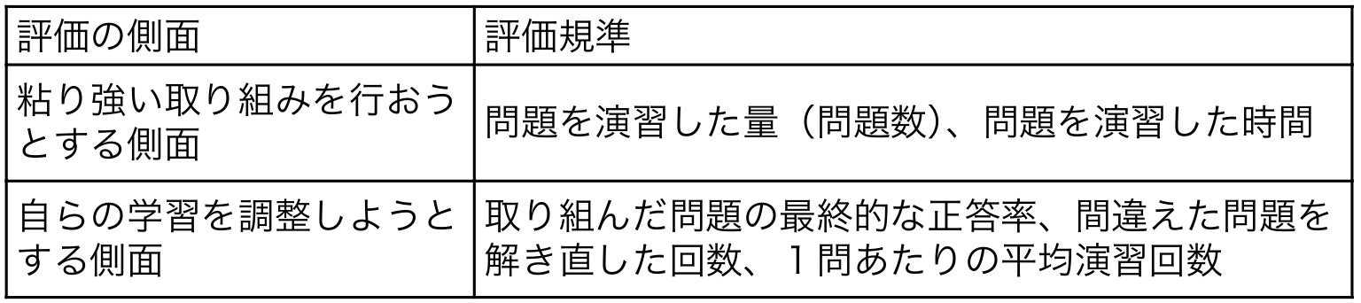 主体的に学習に取り組む態度については、国立教育政策研究所の『学習評価の在り方ハンドブック』(※1)に基づき、評価の2軸となる一方の「粘り強い取り組みを行おうとする側面」を、問題を演習した量、問題を演習した時間で、もう一方の「自らの学習を調整しようとする側面」を、取り組んだ問題の最終的な正答率、間違えた問題を解き直した回数、1問あたりの平均演習回数でそれぞれ捉え、あらかじめ設定した評価規準をもとに数値化して、最終的な評価を決定しました。