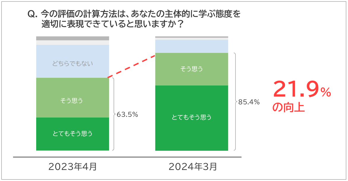 「今の評価の計算方法は、あなたの主体的に学ぶ態度を適切に表現できていると思いますか?」という質問に対して、「とてもそう思う」もしくは「そう思う」と肯定的な回答をした生徒の割合は、1学期末には63.5%だったところ、学年末には85.4%と上昇。そのうち、「とてもそう思う」と回答した生徒は、1学期末には28.9%でしたが、学期末には57.1%と大きく増加しました。