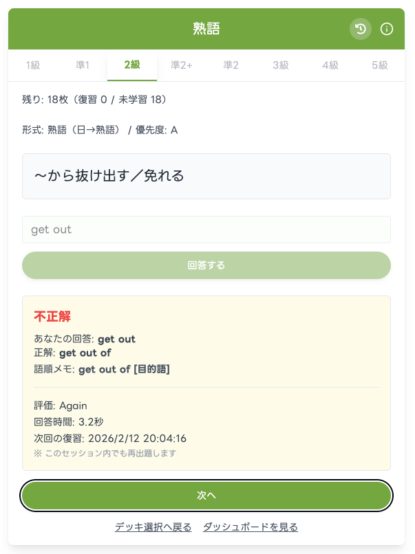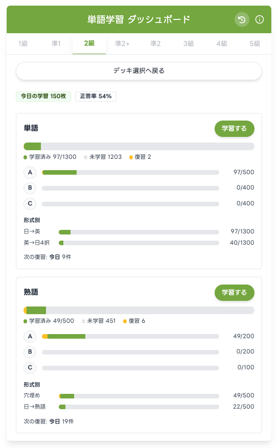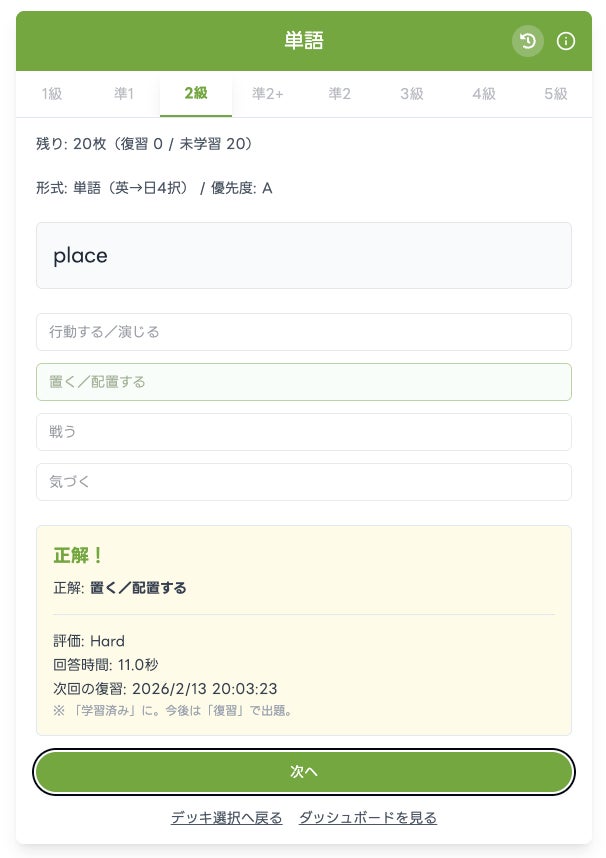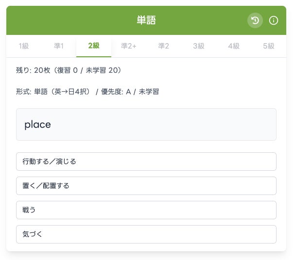 単語1,300/熟語500(2級)を同一デッキで学習。想起(入力)と認識(4択)を使い分け、復習は間隔反復スケジューラで自動化