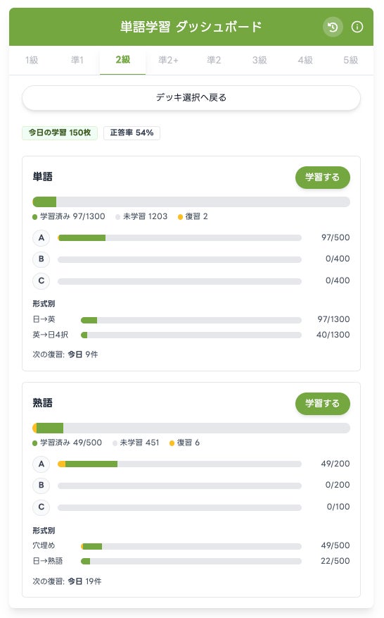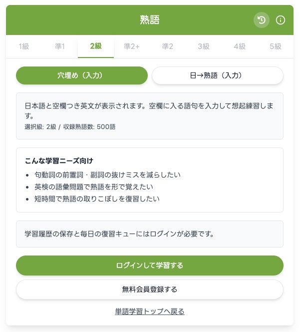 英検®2級の同一デッキ(単語1,300語/熟語500語)を使い、次の2つの学習形式を追加しました。