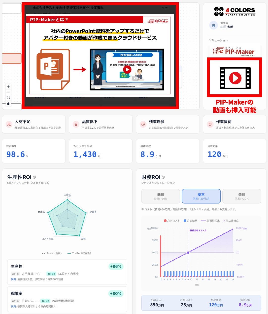 株式会社4COLORS(本社:神奈川県横浜市、代表取締役:加山 緑郎)は、2026年4月1日、業務課題をひとこと入力するだけで、AIが費用対効果(ROI)を可視化し、「工数20%削減」や「ROI 300%」といった説得力のある解決提案書をスピーディーに自動生成・共有できる『ROI-Maker』を正式リリースしました。