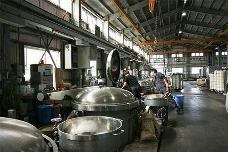ひとつの釜で1日に2~3色染めていきます。釜には150kgもの量が入り、その釜が工場の中には100個程設置されているとのこと。染め上がったら別の釜に移動させ乾燥させます。機械が多く、熱を発するため、夏は室温が50度くらいになるそうです。