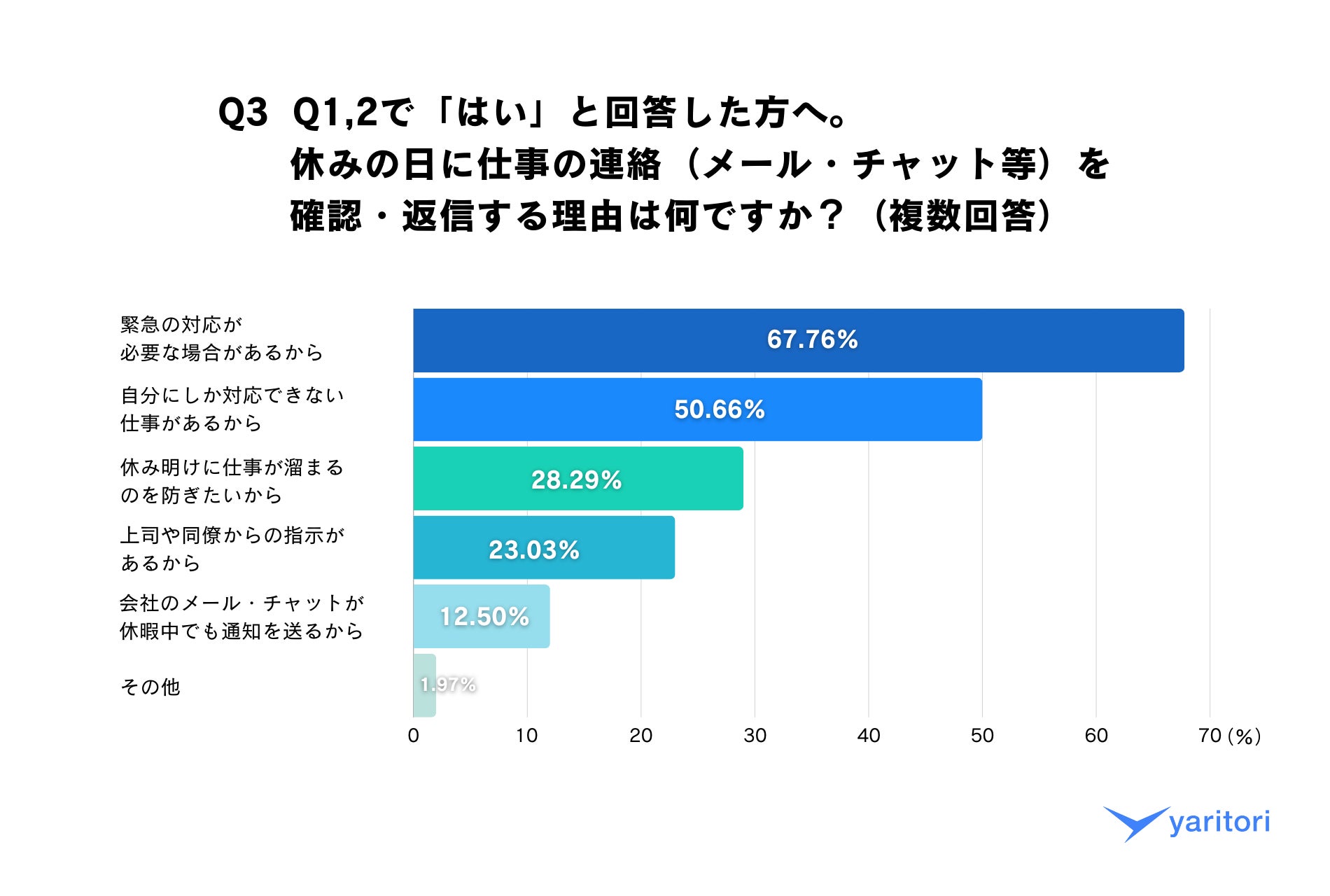 さらに、Q1,2で「はい」と回答した方に、「休みの日に仕事の連絡を確認・返信してしまう理由」についても聞いたところ(複数回答)、