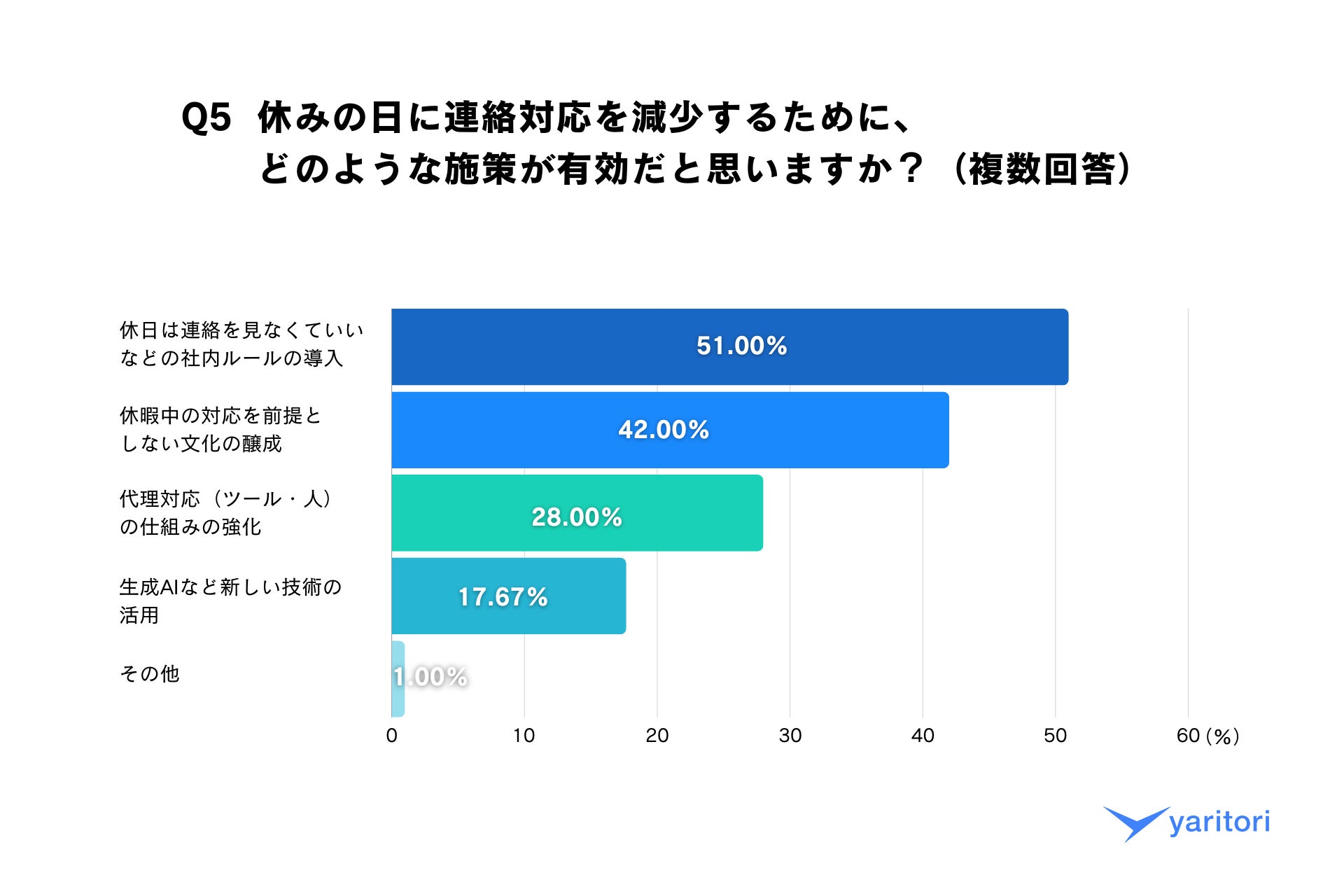 最後に、休みの日の連絡対応を減少するために有効な対策を聞いたところ(複数回答)、
