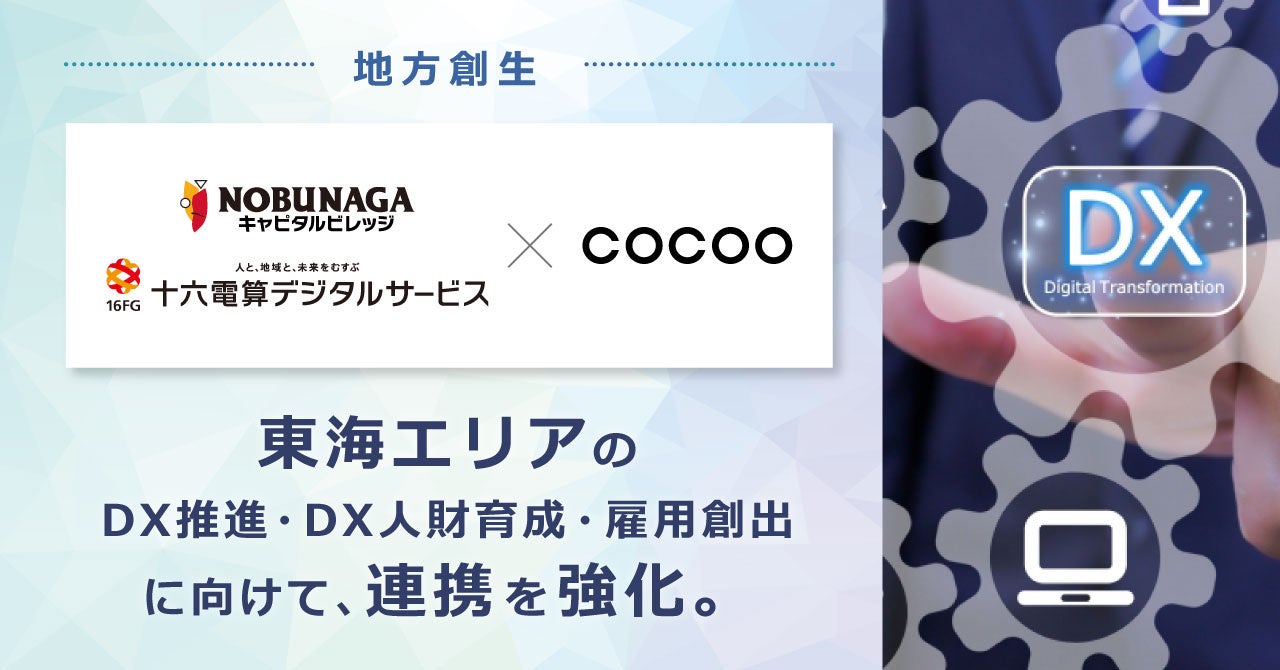 「人財」×「デジタル」事業で社会のDX化を支援するコクー株式会社(本社:東京都千代田区、代表取締役CEO:入江 雄介)は、株式会社十六フィナンシャルグループ(所在地:岐阜県岐阜市)の投資専門子会社であるNOBUNAGAキャピタルビレッジ株式会社と株式会社十六フィナンシャルグループ、株式会社電算システムホールディングスの合弁会社である十六電算デジタルサービス株式会社の2社と連携し、東海エリアのDX推進、DX人財育成、雇用創出に向けた取り組みを開始したことをお知らせいたします。