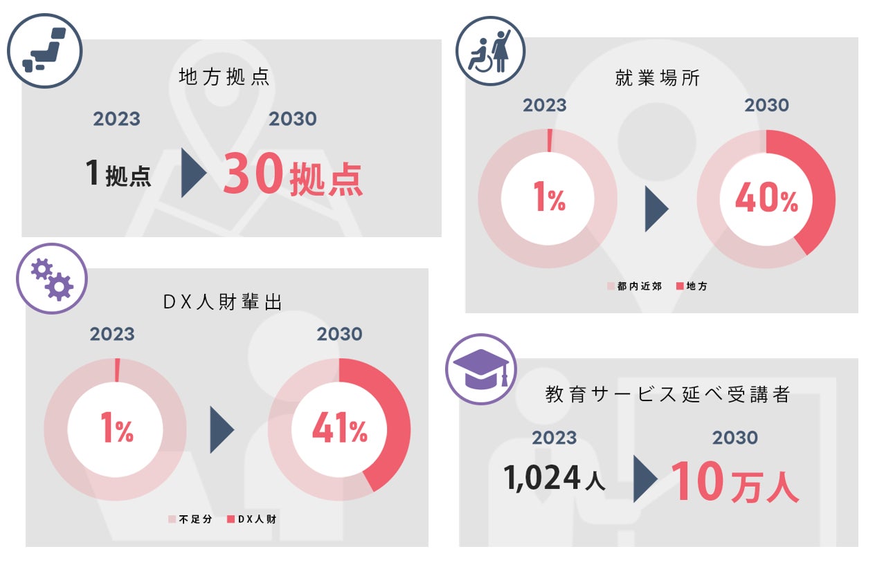 また、2023年7月に策定した長期経営計画「VISION2030」においては「ダイバーシティ&インクルージョン」「地方創生」「業務提携」を重点テーマとして取り組み、『DX人財輩出企業 No.1~日本の生産性向上を実現し、誰もがイキイキ働ける社会をつくる~』を実現してまいります。