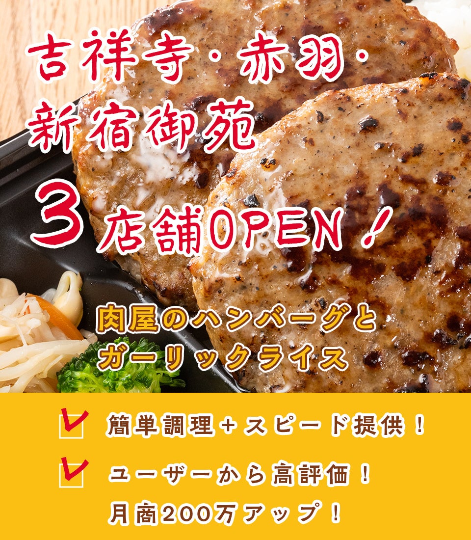 簡単調理!ユーザー高評価!月商200万UP!ボリューム満点のハンバーグ弁当専門店【肉屋のハンバーグとガーリックライス】が吉祥寺・赤羽・新宿御苑 3店舗OPEN!