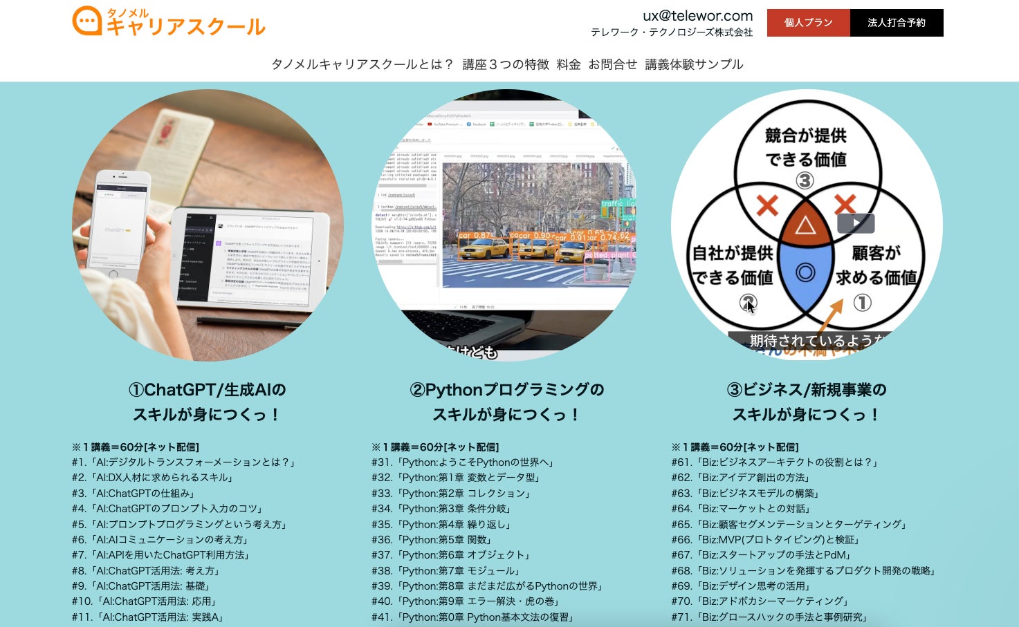 タノメルキャリアスクールは、AIを中心としたビジネススキルを身につけるためのオンライン学習プログラムです。ChatGPT、生成AI、DX、Python、機械学習、事業構築など100講義の受講し放題講義動画と、チャットグループによるサポートを組み合わせて、受講者のキャリア構築を支援します。