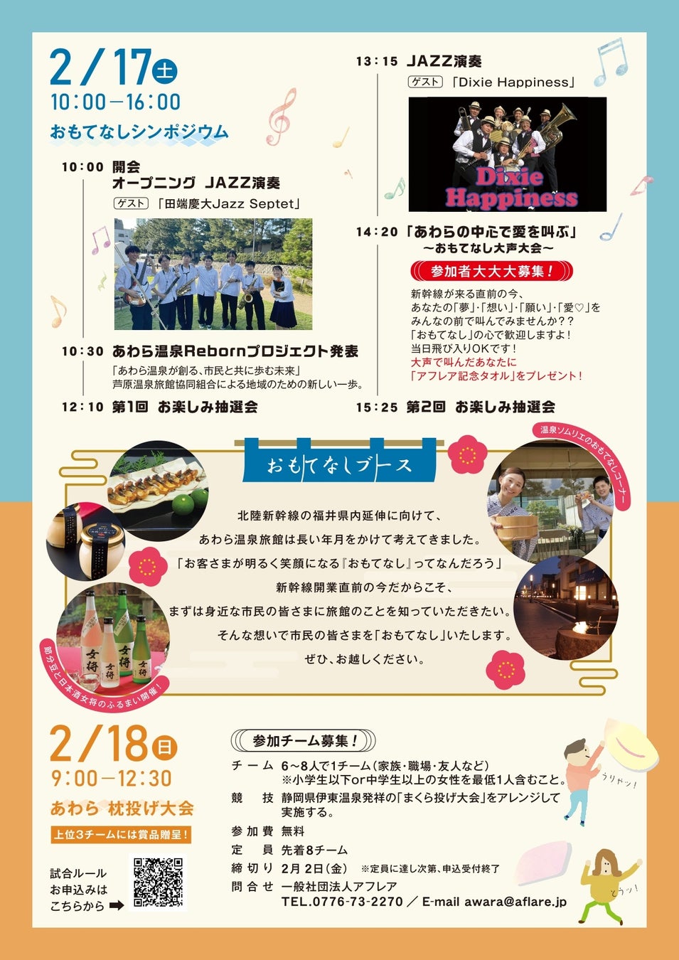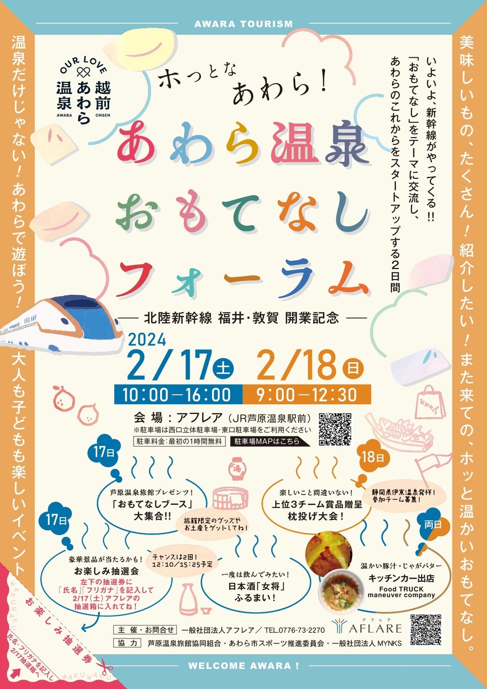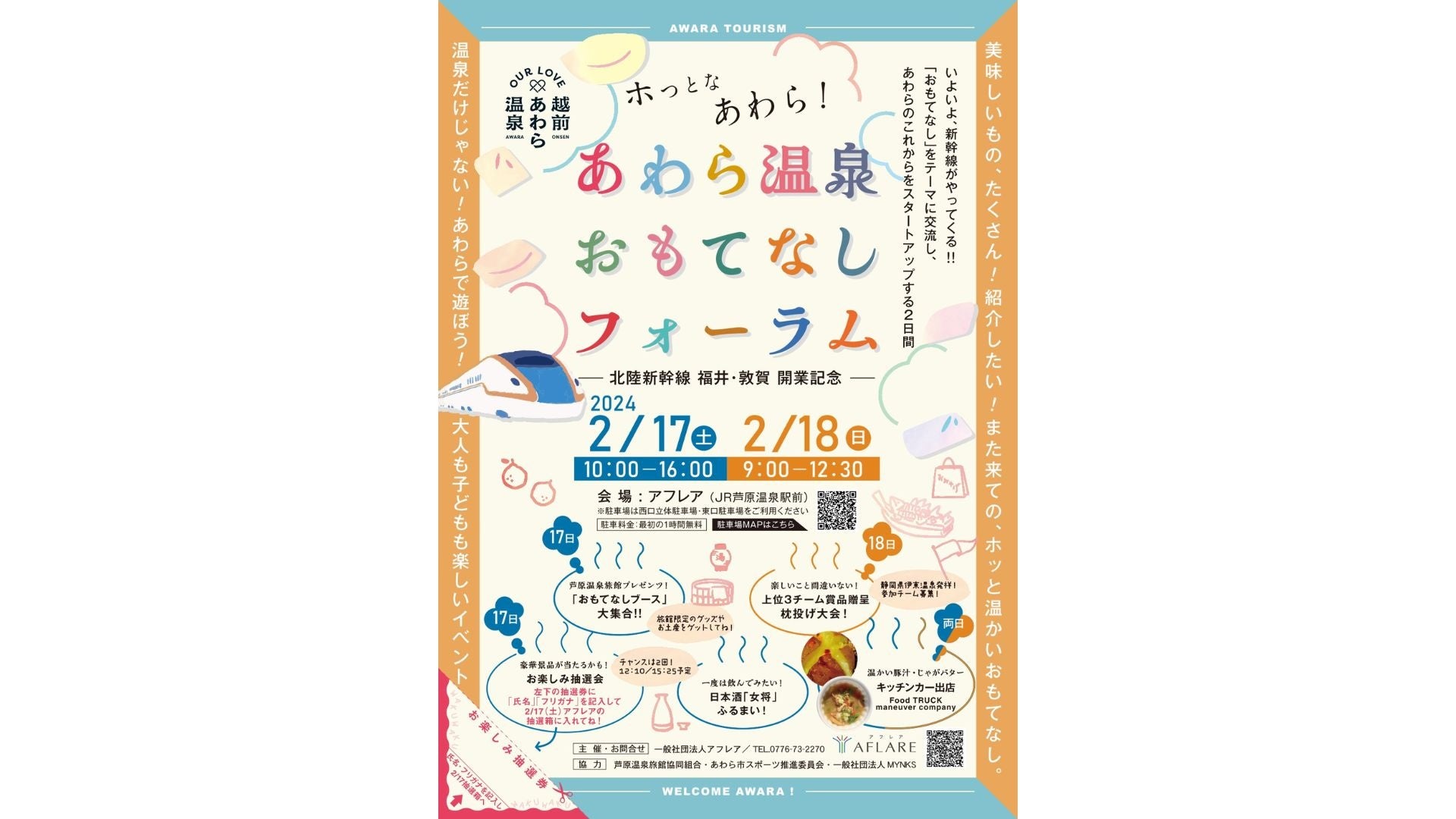 一般社団法人アフレアは、2024年2月17日(土)、18日(日)の2日間、福井県あわら市の芦原温泉駅西口賑わい施設「アフレア」で「あわら温泉おもてなしフォーラム」を開催します。