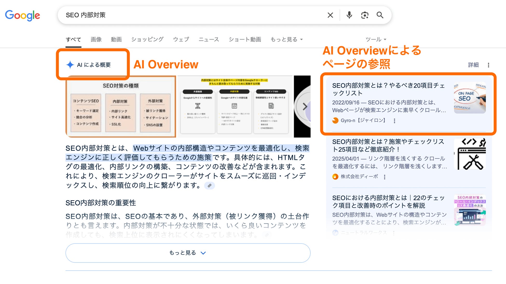 Google検索結果に表示される「AI Overview(AIO/AIによる概要)」は、Googleの生成AI「Gemini」がユーザーの検索意図を深く理解し、関連情報を要約して検索画面上部に表示する機能です。このAIOの表示頻度は上がってきており、AIOが検索体験の「新たなスタンダード」として定着しつつあります。ドイツのSEO専門家Kelvin Indig氏による調査では、検索クエリの約40%にAI Overview(AIO)が表示されていると報告されており、ユーザーの88%がAIO内の「もっと見る」をクリックしています。