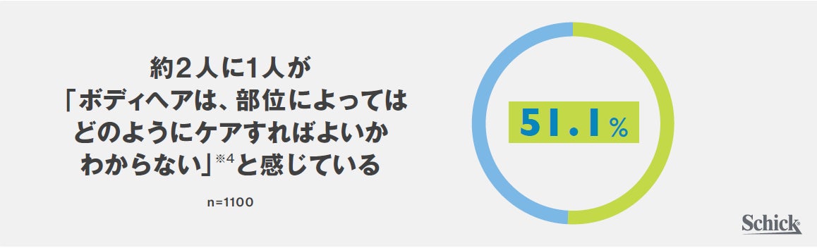 メンズボディグルーミング市場は、2021年までの3年間で約4倍に拡大しているにもかかわらず、「ボディヘアは、部位によってはどのようにケアすればよいかわからない」(※4)と回答した人が51.1%という結果になりました。また「肌を傷つける不安が大きい」と答えた人も51.1%という結果になったことから、ボディヘアのケアに対して正しい方法がわからず、不安を抱えている人が多いことが伺えます。