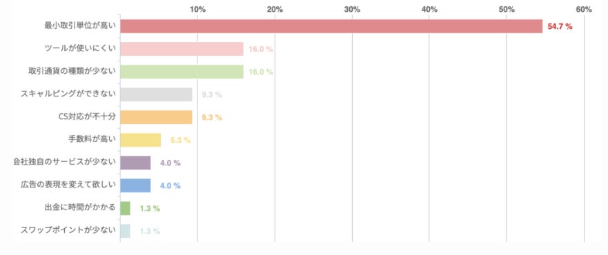 アンケートによれば、「最小取引単位が高く、少額取引ができない」ことに不満を示している投資家が圧倒的に多かった。回答者の割合は54.7%と、同率2位の「ツールの使いにくさ」、「取引通貨ペアの少なさ」(16.0%)の3倍以上となっている。