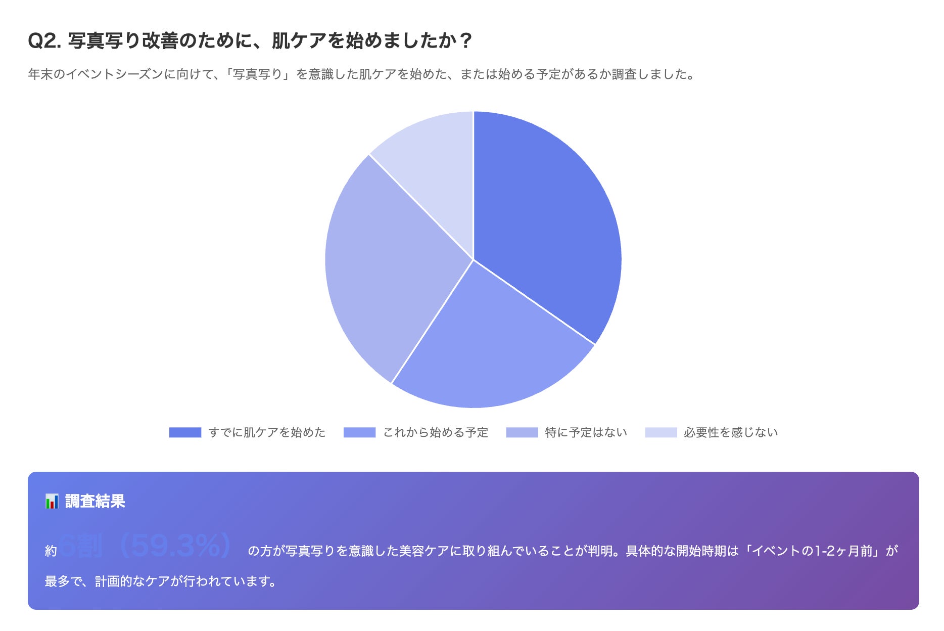 具体的な開始時期としては、「イベントの1-2ヶ月前」(42.3%)が最も多く、計画的にケアを始める方が多いことが判明しました。