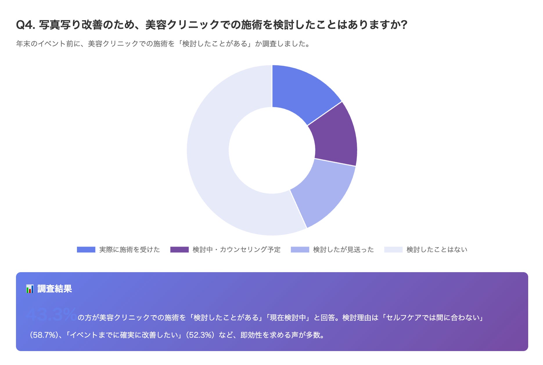 その結果、43.3%の方が「検討したことがある」「現在検討中」と回答し、写真写りを意識したタイミングで美容医療への関心が高まる傾向が明らかになりました。
