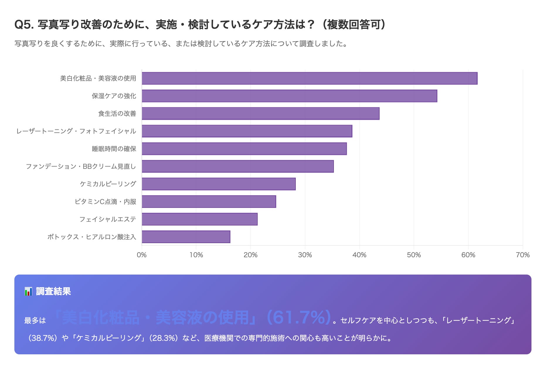 その結果、「美白化粧品・美容液の使用」が61.7%で最も多く、次いで「保湿ケアの強化」(54.3%)、「レーザートーニングやフォトフェイシャル」(38.7%)という結果になりました。