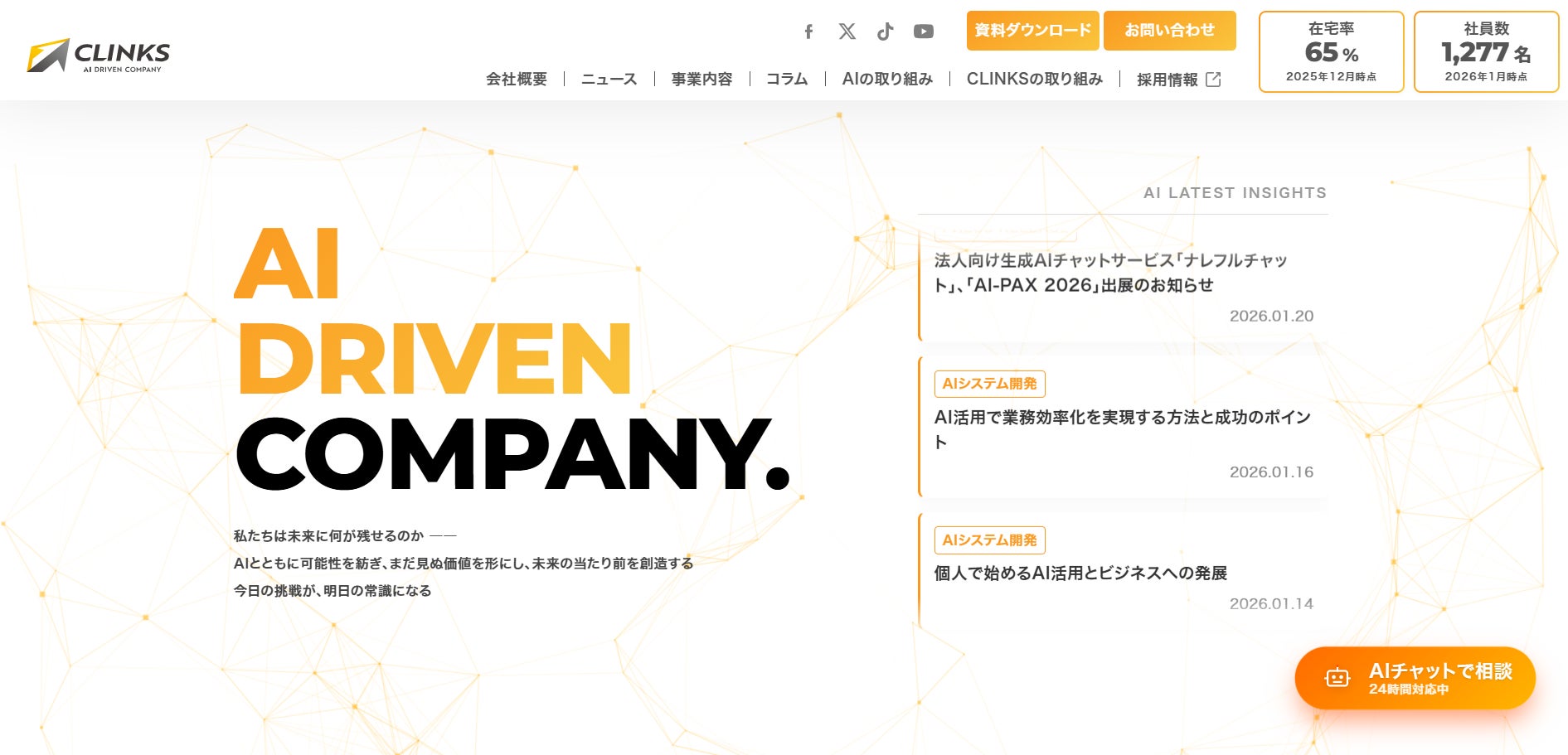 CLINKS株式会社(本社:東京都中央区、代表取締役:河原浩介)は、2026年1月26日(月) 、コーポレートサイトのTOPページを全面刷新したことを発表しました。あわせて、AI活用戦略の全容を公開する「AIの取り組み」ページを開設。 1,030名のAI資格取得や開発業務効率200%向上など、自社実践で得た具体的成果とノウハウを体系化し、企業のAI導入支援事業を本格展開することを明らかにしました。