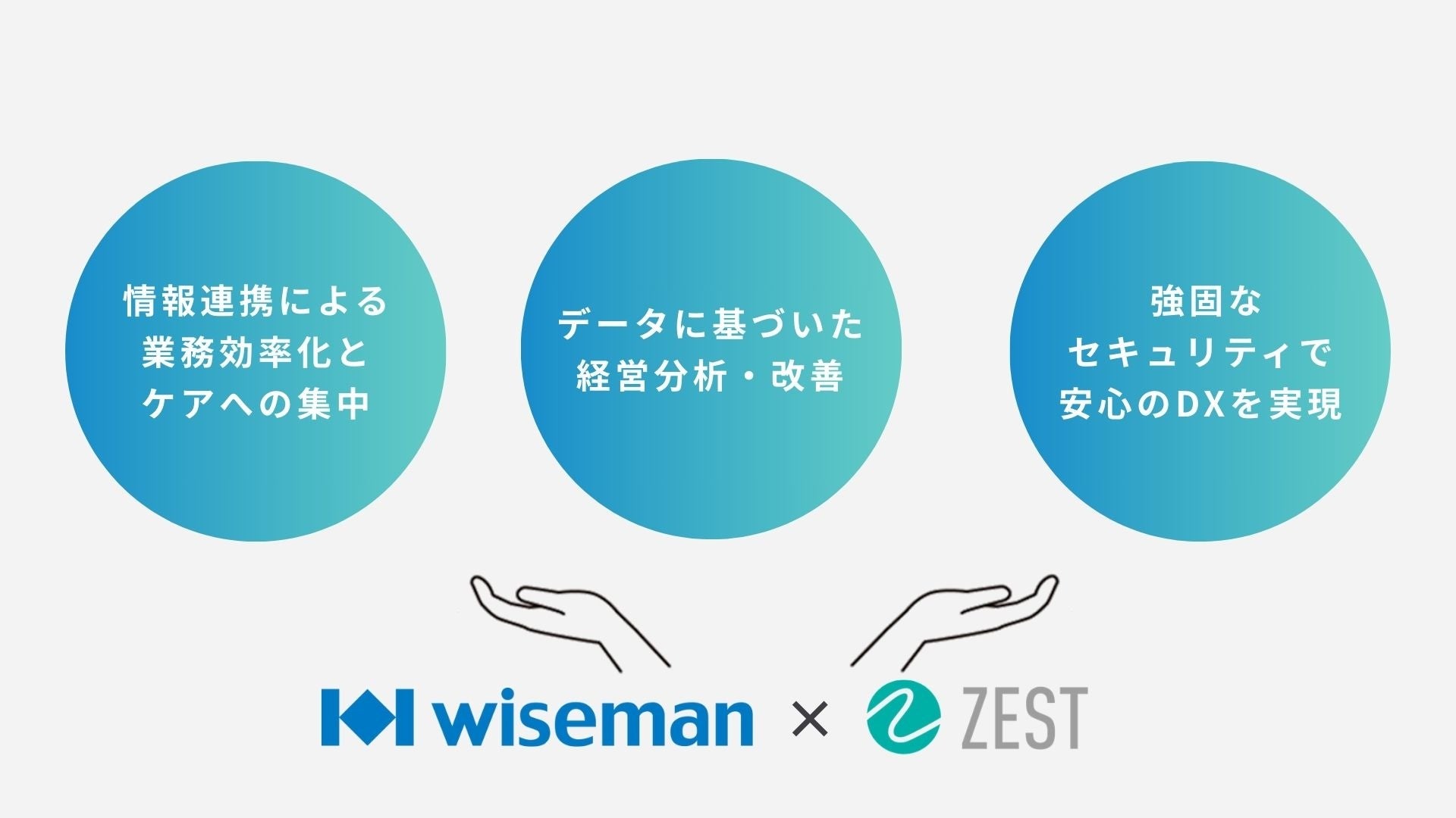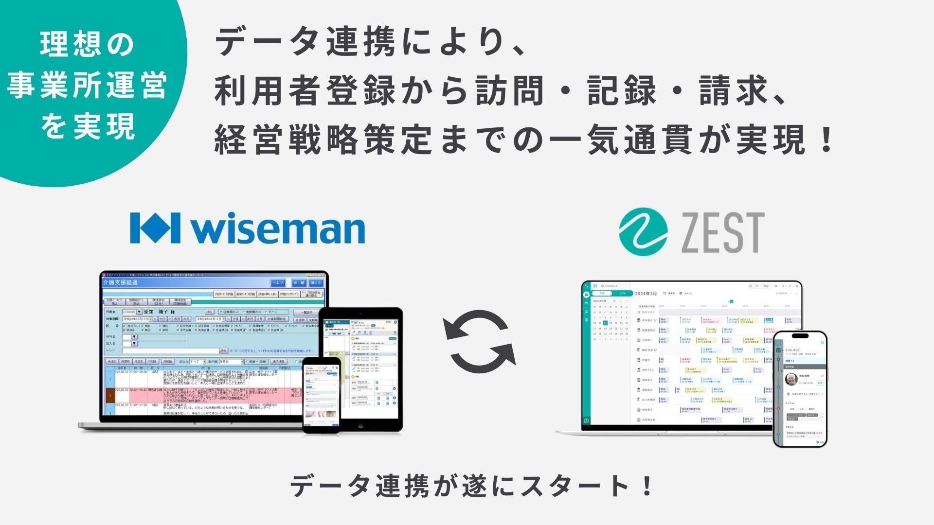 そこで、ゼストはあらゆるツールとのデータ連携を通じて業務のDX化を促進し、業界の業務効率化を抜本的に推進します。業務提携を結んでおり既にデータ連携を実施している株式会社エス・エム・エスの「カイポケ」、株式会社ロジックの「Care-wing」に加え、今回、株式会社ワイズマンの「ワイズマンシステムSP」との連携も開始しました。