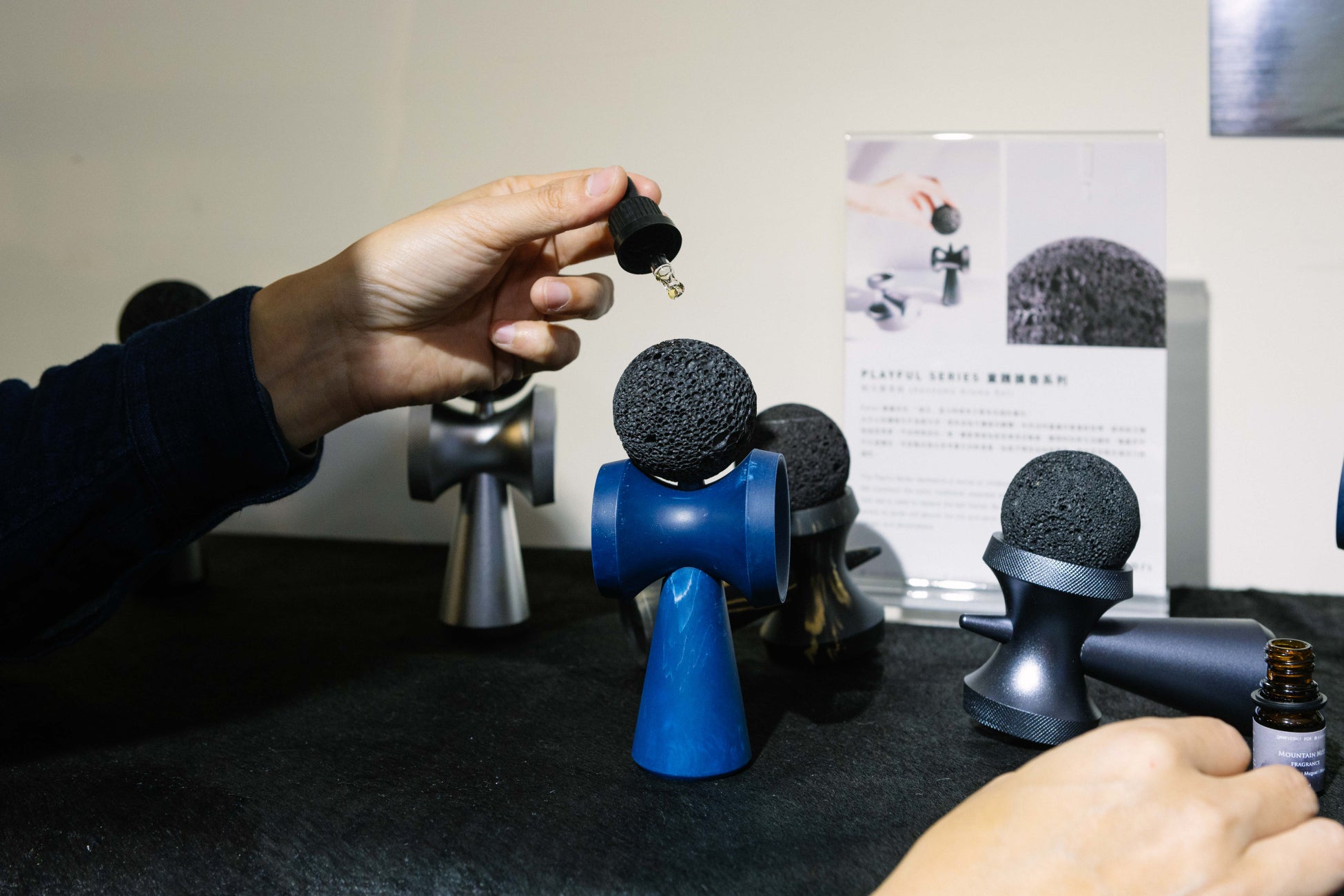 剣玉の玉には天然の火山岩を使用し、香りを吸収・拡散するディフューザーとして機能。Sean王翔は、ロンドンで構築した「共生(Symbiosis)」という理念をデザインに取り入れ、ミニマルな美学の中に繊細で奥深い要素を融合。日常の道具に機能性と上質さを兼ね備えたデザインで、現代の暮らしに優雅さと楽しさを加えている。