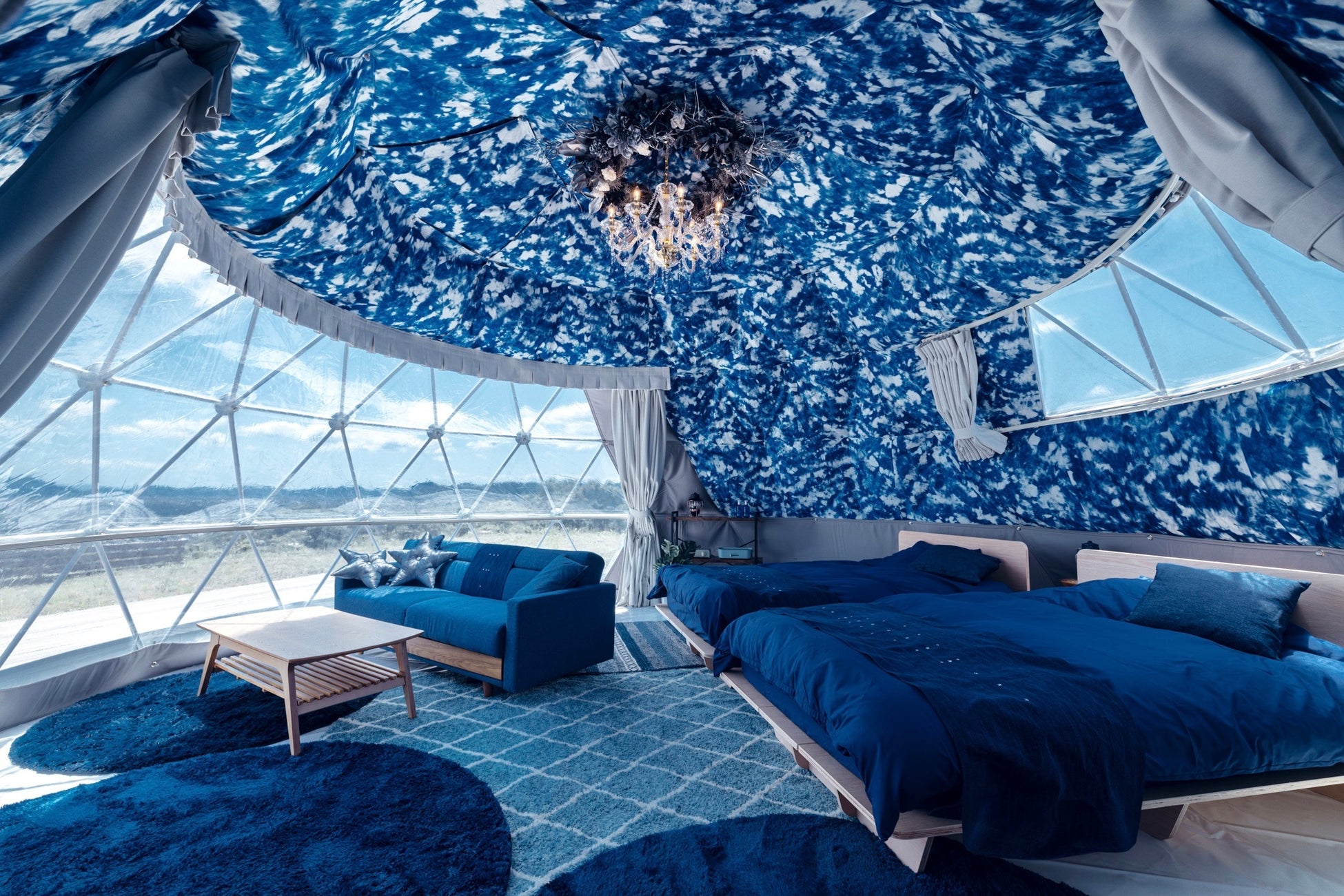 倉敷のグランピング施設Soraniaとの共同開発によるラグジュアリードームテント。岡山産デニムとインディゴを用いた内装で、心安らぐ非日常空間を演出。星形クッション、ブランケット、巨大なデニムローズの照明が目を引く。