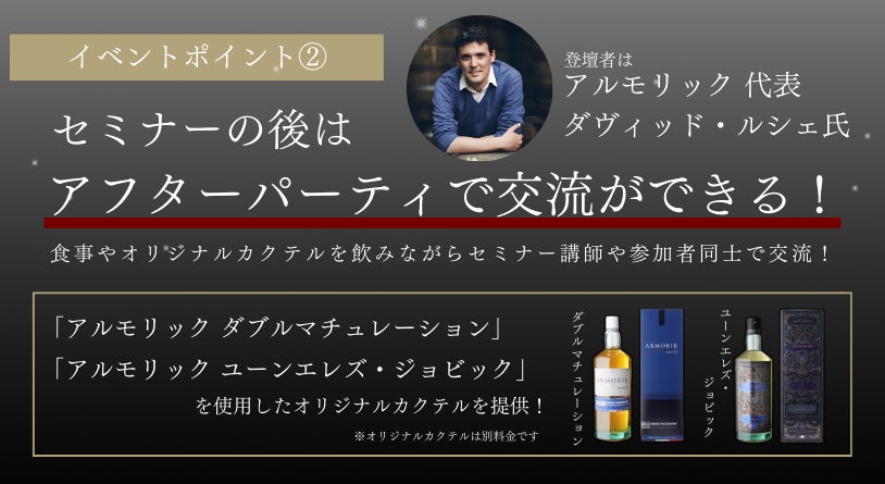 また、会場にお越しのお客様には、「アルモリック クラシック」のハイボールをウェルカムドリンクとしてご提供!喉を潤しながらセミナーをお聞きできます!また、以前のイベントでも大好評だったお食事とオリジナルカクテルもご用意しております!(オリジナルカクテルは別料金)