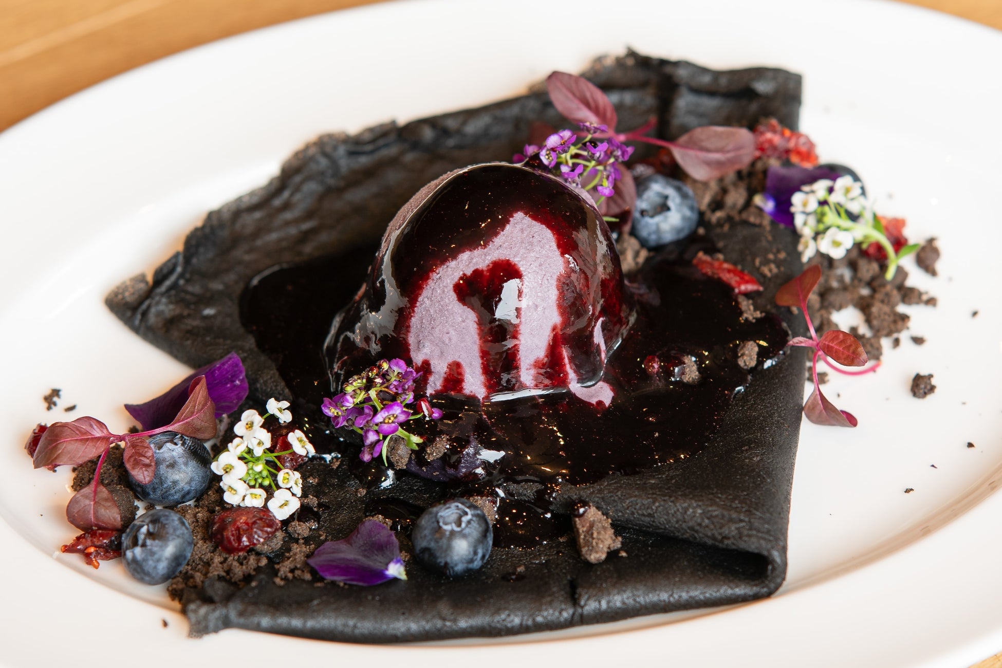 このスペシャル・メニュー「XM VIOLET GLACE & BLACK CREPE」は、6月27日(金)から7月14日(月)までの期間限定で楽しめる。