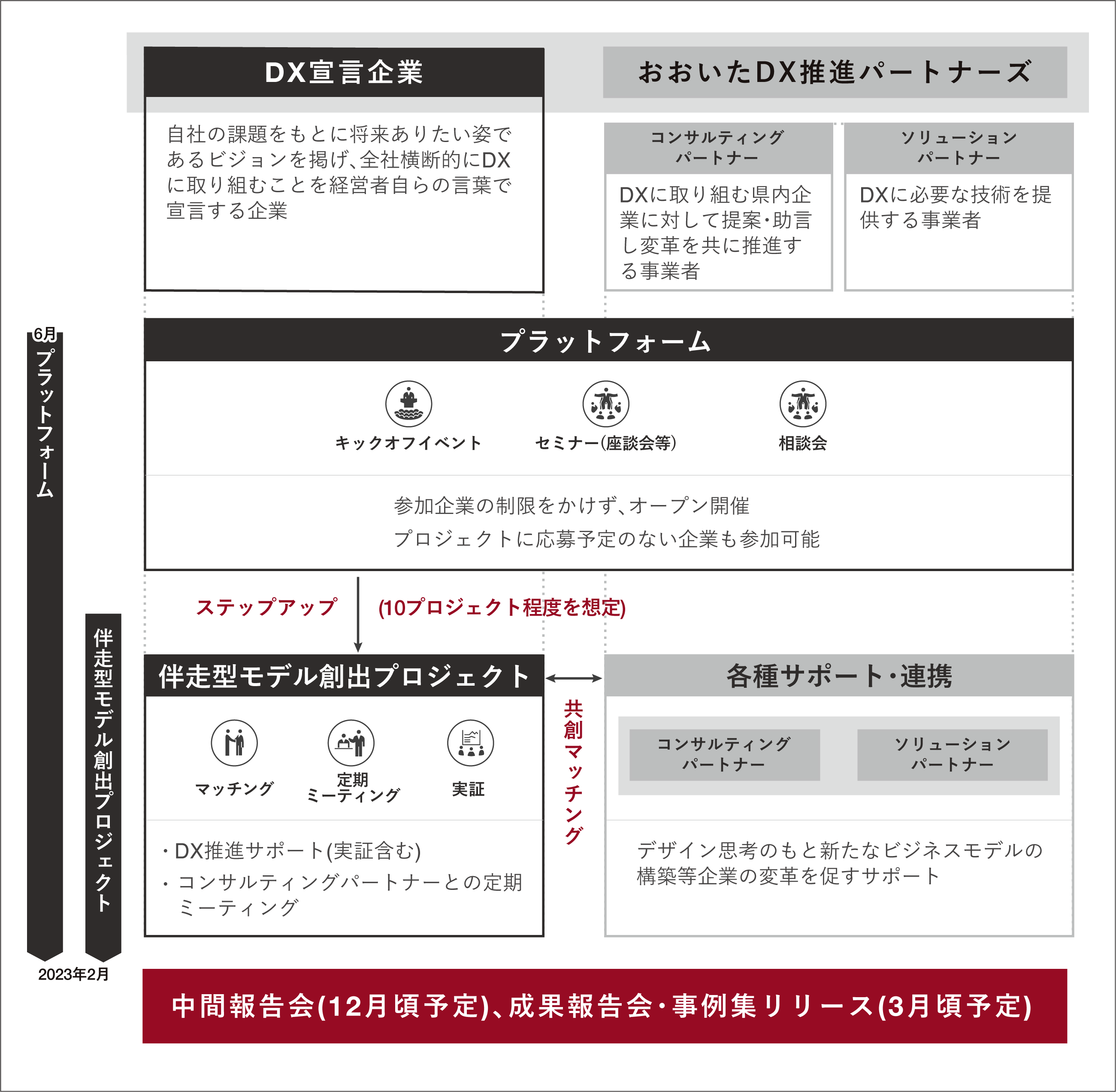 | 伴走型モデル創出プロジェクト | プラットフォームに参加している「DX宣言企業」の中から10プロジェクト程度を選定し、DXの促進に向けて、「コンサルティングパートナー」や「ソリューションパートナー」とのマッチングやメンタリング、DXのサポート等の支援を行います。 |