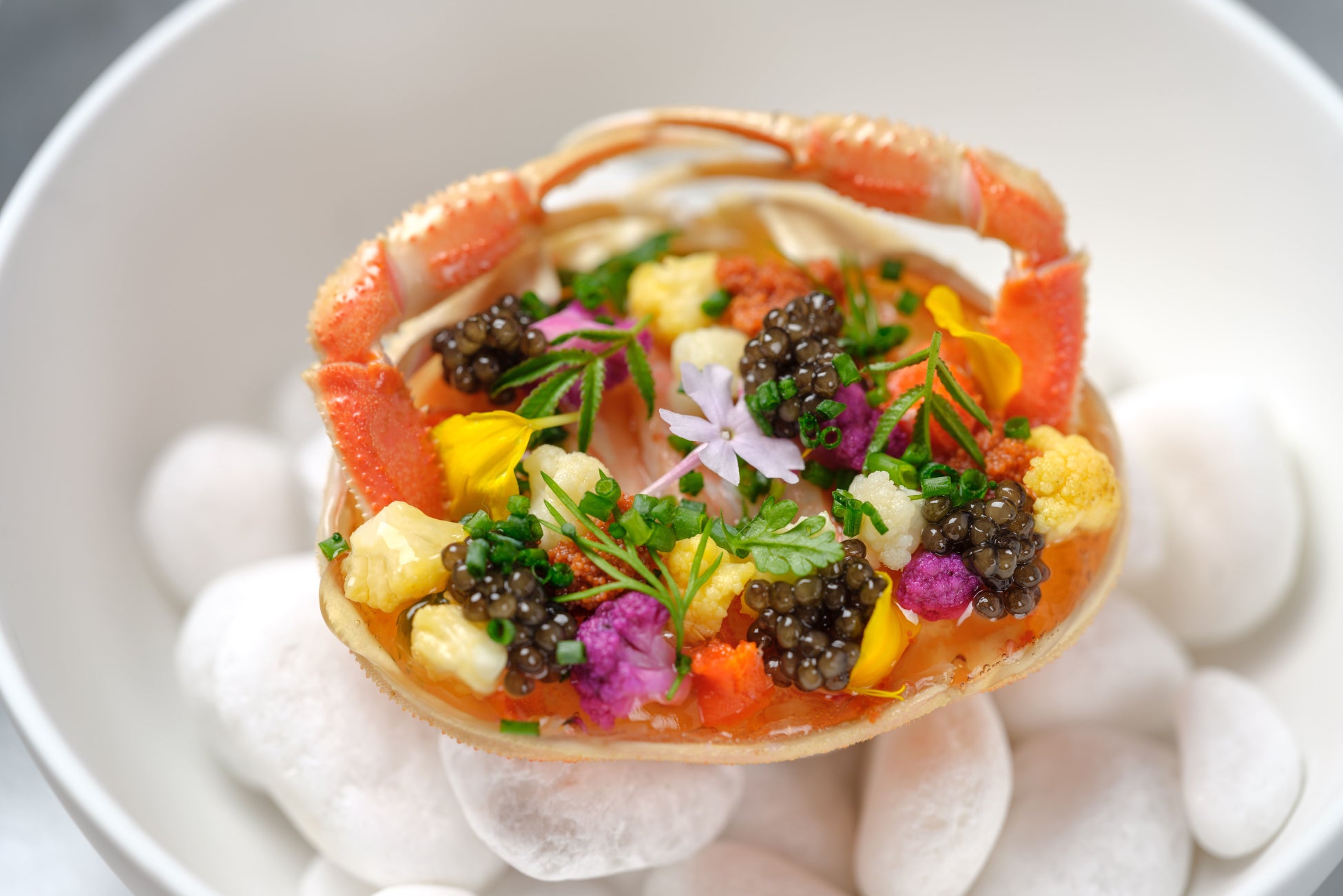 【コース内容】・香箱ガニのサラダ カリフラワーのムース 蟹酢ゼリー キャビア