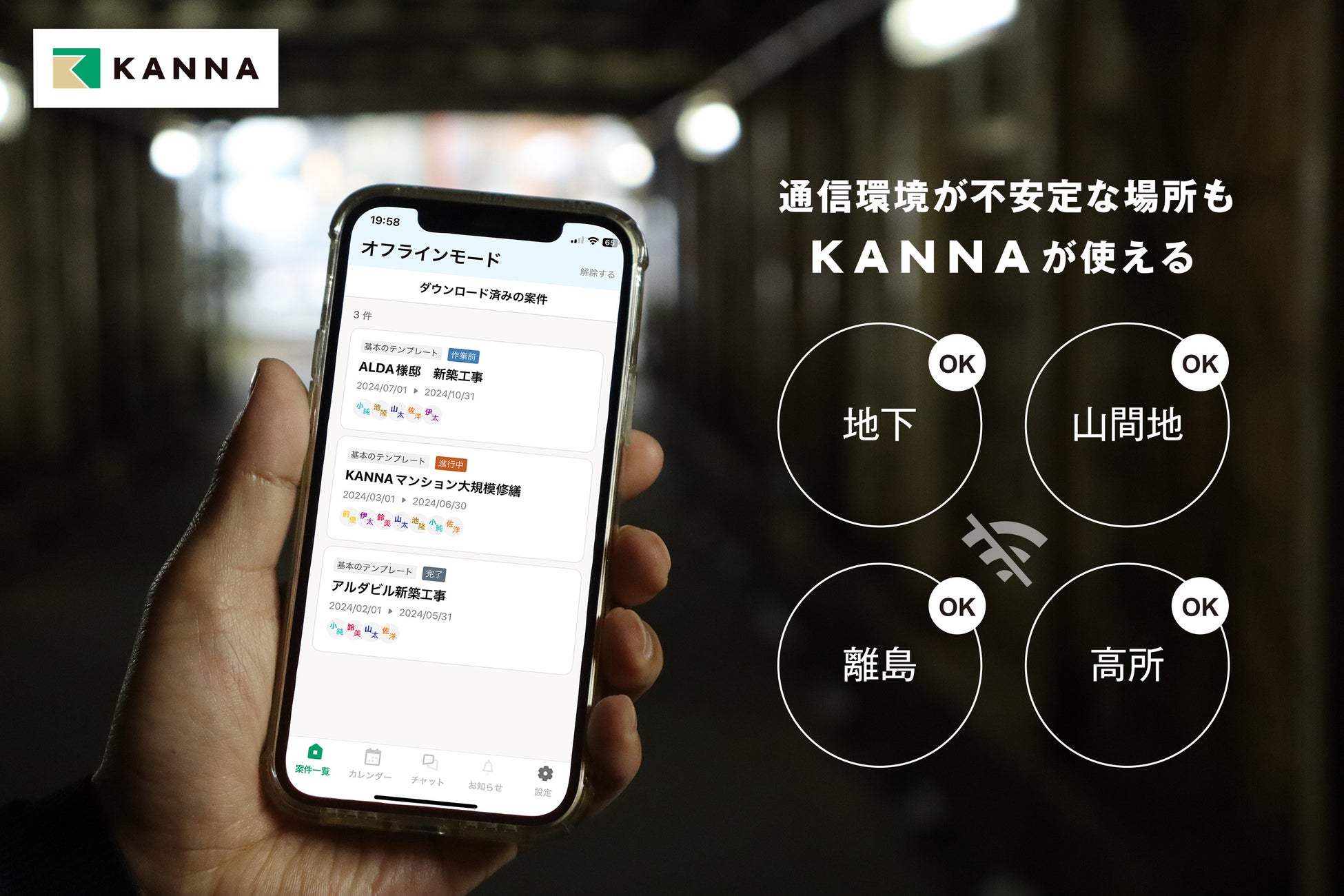 建設業、不動産業、製造業など世界中のノンデスクワーク業界における現場の生産性アップ実現に取り組む株式会社アルダグラム(本社:東京都港区、代表取締役:長濱光、以下:アルダグラム)が提供する現場DXサービス「KANNA(カンナ)」は、本日6月26日よりネットワーク接続に制限がある環境でもKANNAのスマートフォンアプリが使える「オフライン機能」の提供を開始します。この機能により、地下や山間地、工場などのネットワーク環境を制限している場所、災害で通信障害が発生した際などオフラインの環境でも、KANNAの案件情報の閲覧やデジタル帳票への書き込みが可能となり、現場の業務効率化に貢献します。
