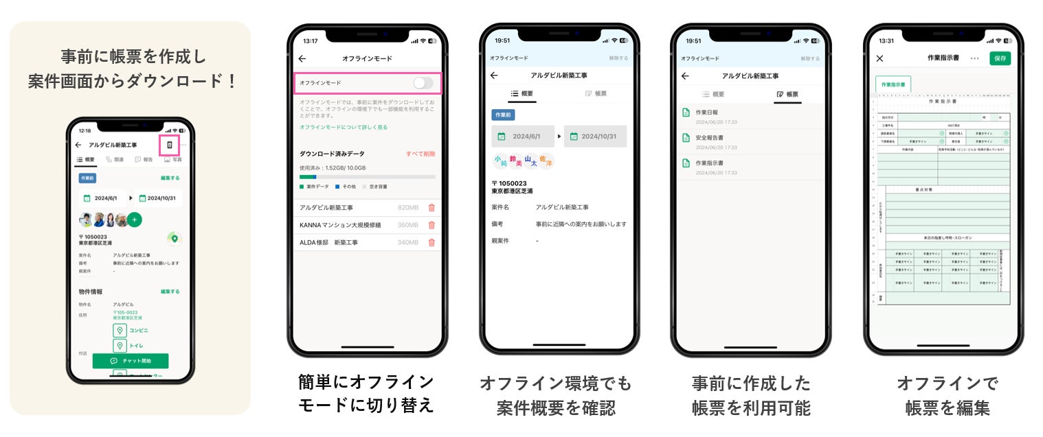 しかし、地下や山間部、厚いコンクリート壁があるビルや商業施設の建設現場など、ネットワーク接続に制限がある環境が多くあります。これまでのKANNAは、ネットワークの接続が必要であったため、このような環境では、スマートフォンアプリを利用することができませんでした。特に、デジタル帳票アプリ「KANNAレポート」は、現場で直接入力する場面が多いため、オフライン機能を提供することで、これまで以上に活用の場所が広がり、業務効率化が期待できます。