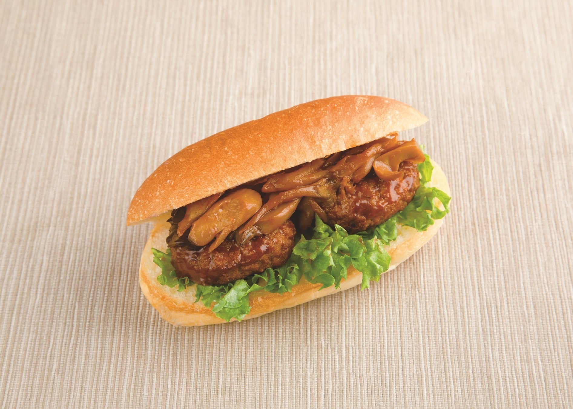 4種のきのこ(舞茸・エリンギ・ぶなしめじ・ひらたけ)を使ったデミグラスソースをたっぷりかけたハンバーグをサンド。