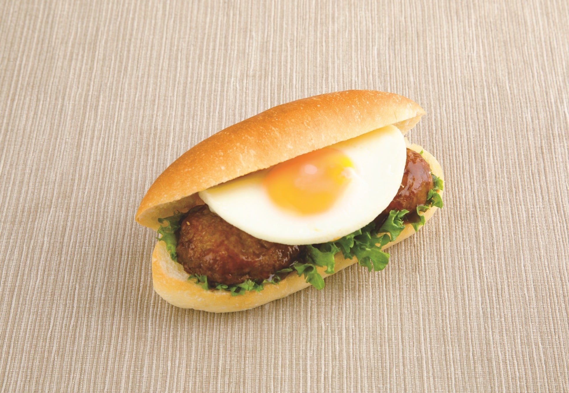 てりやきハンバーグの上に月に見立てた大きな目玉焼きをトッピング。お月見シーズンにぴったりな食べ応え抜群のコッペパン。