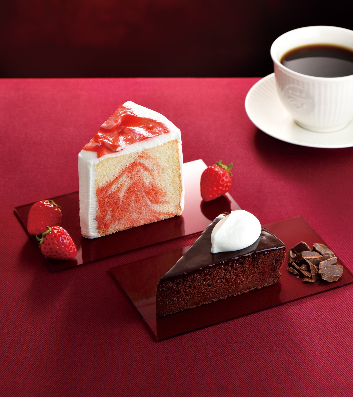 「飲むチョコレート~カカオ57%~」「濃いガトーショコラ~カカオ72%~」「苺のシフォンケーキ」「2つのサンド パストラミビーフとチーズポテト」