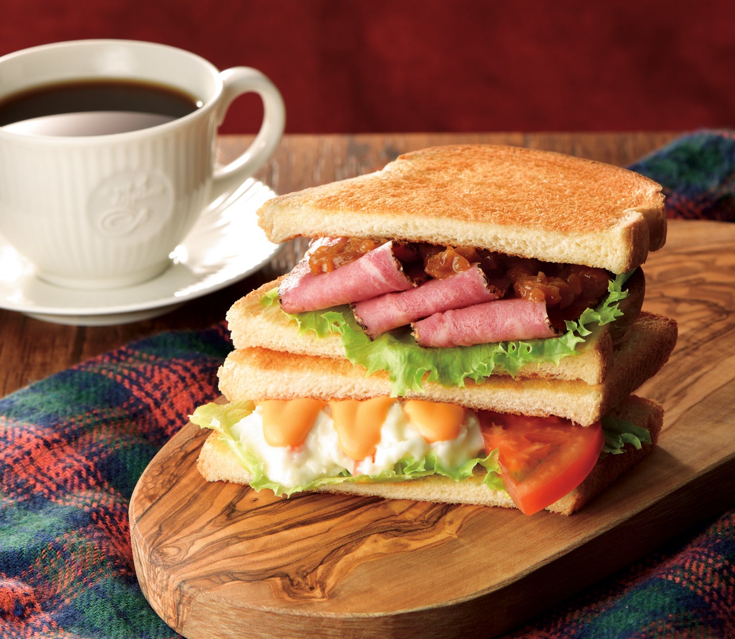 フードメニュー「2つのサンド パストラミビーフとチーズポテト」は、上下で異なる味わいをお楽しみいただけるトーストサンドです。上段は黒胡椒が効いたパストラミビーフに、醤油・黒胡椒などの香辛料と炒めた玉ねぎをあわせた和風仕立てのソテーオニオンソースで仕上げた、食べ応えのあるサンドです。下段はポテトサラダにしゃきしゃきのレタスとフレッシュなトマト、濃厚なチェダーチーズソースをあわせました。