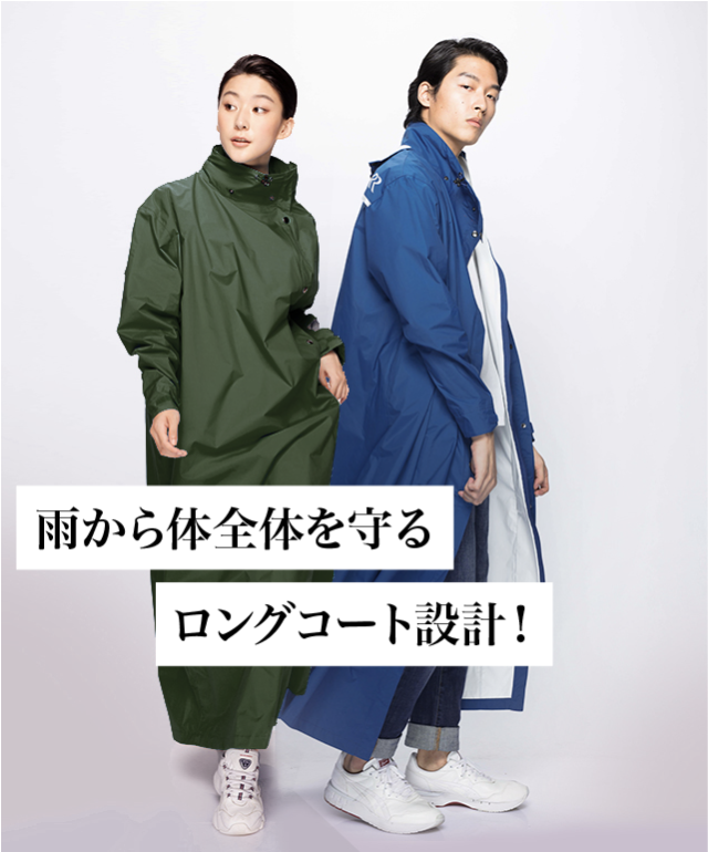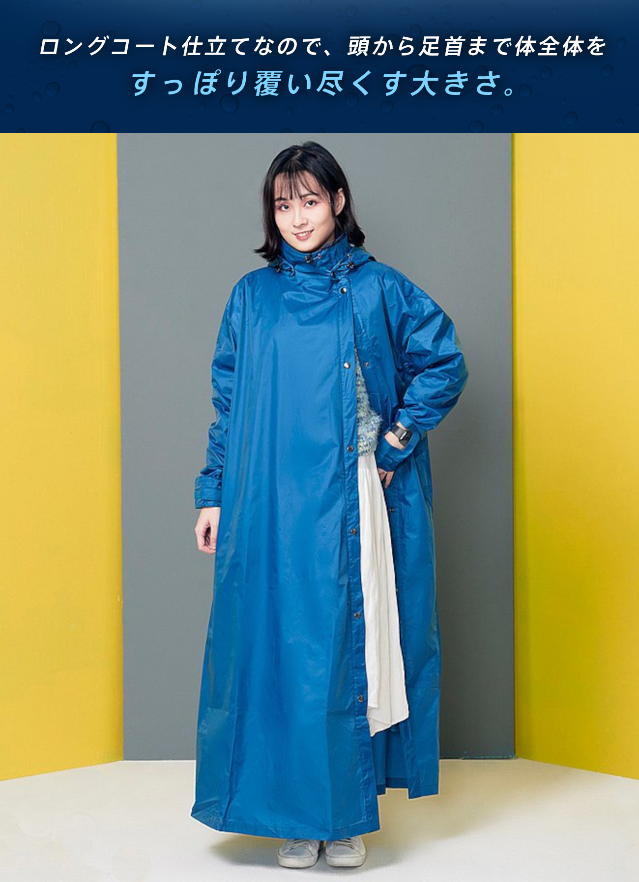 体全体が雨に濡れないために、足首まで隠れる超ロング丈を採用しました。